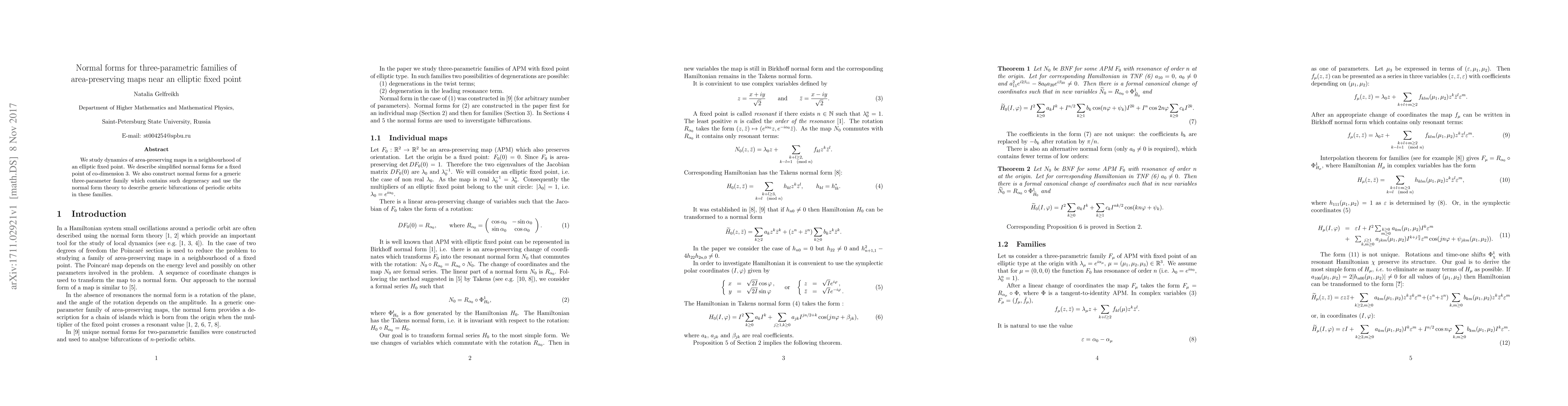 This paper explores the dynamics of area-preserving maps around an elliptic fixed point, deriving simplified normal forms for co-dimension 3 fixed points and constructing normal forms for a three-parameter family to describe bifurcations of periodic orbits.