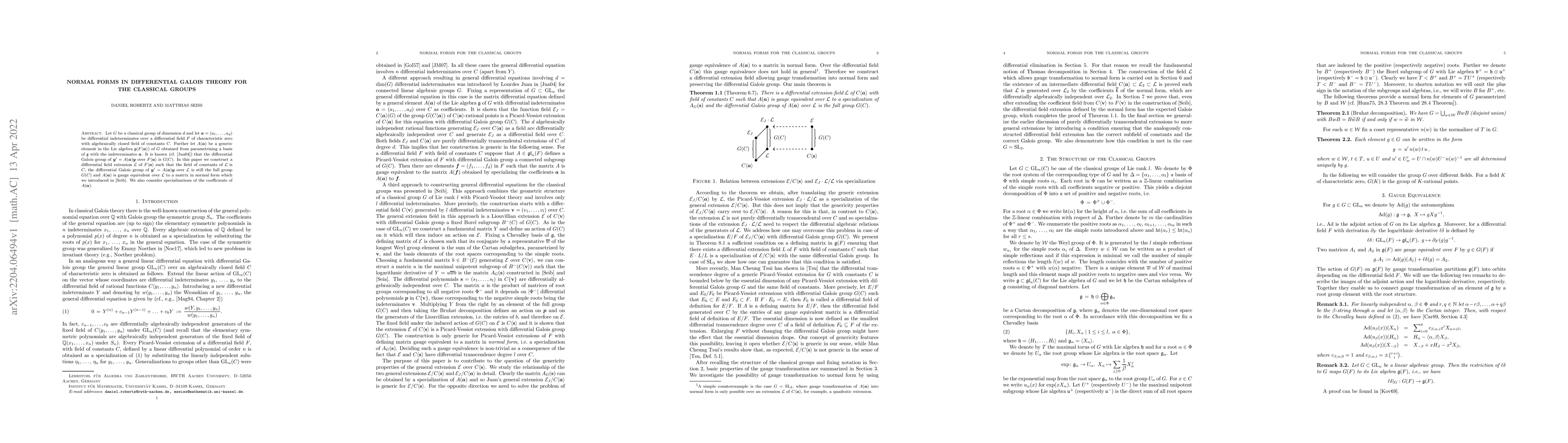 Let $G$ be a classical group of dimension $d$ and let $\boldsymbol{a}=(a_1,\dots,a_d)$ be differential indeterminates over a differential field $F$ of characteristic zero with algebraically closed field of constants $C$. Further let $A(\boldsymbol{a})$ be a generic element in the Lie algebra $\mathfrak{g}(F\langle \boldsymbol{a} \rangle)$ of $G$ obtained from parametrizing a basis of $\mathfrak{g}$ with the indeterminates $\boldsymbol{a}$. It is known (cf. work by Juan) that the differential Galois group of $\boldsymbol{y}'=A(\boldsymbol{a})\boldsymbol{y}$ over $F\langle \boldsymbol{a} \rangle$ is $G(C)$. In this paper we construct a differential field extension $\mathcal{L}$ of $F\langle \boldsymbol{a} \rangle$ such that the field of constants of $\mathcal{L}$ is $C$, the differential Galois group of $\boldsymbol{y}'=A(\boldsymbol{a})\boldsymbol{y}$ over $\mathcal{L}$ is still the full group $G(C)$ and $A(\boldsymbol{a})$ is gauge equivalent over $\mathcal{L}$ to a matrix in normal form which we introduced in work by Seiss. We also consider specializations of the coefficients of $A(\boldsymbol{a})$.