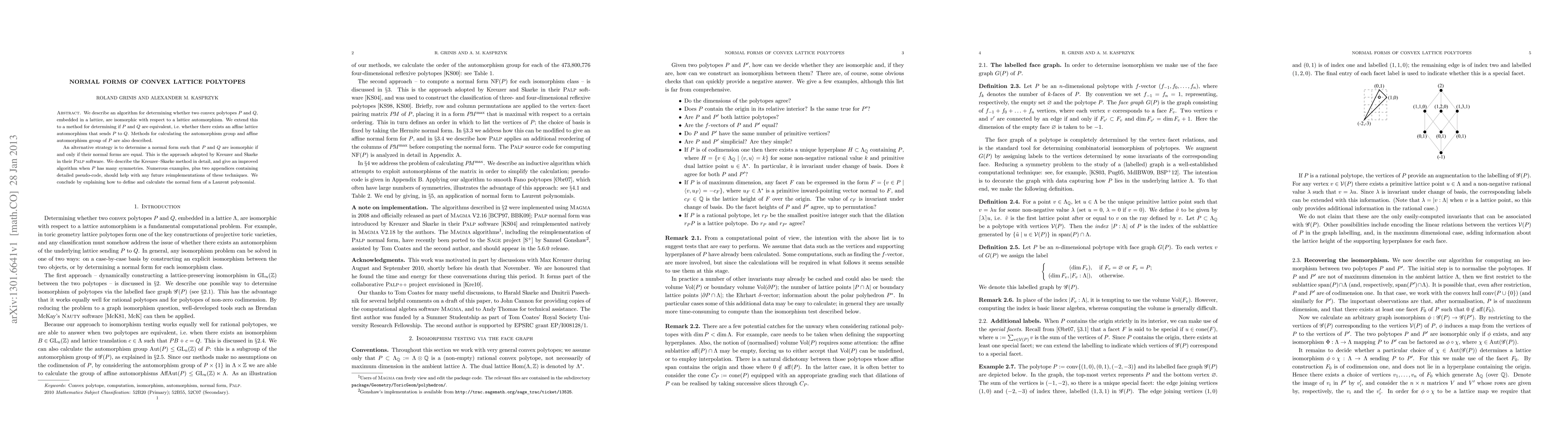 This paper presents an algorithm for determining the isomorphism and equivalence of convex lattice polytopes P and Q, focusing on the Kreuzer-Skarke method for finding normal forms. It also improves the algorithm for polytopes with many symmetries and includes detailed pseudo-code for future implementations.