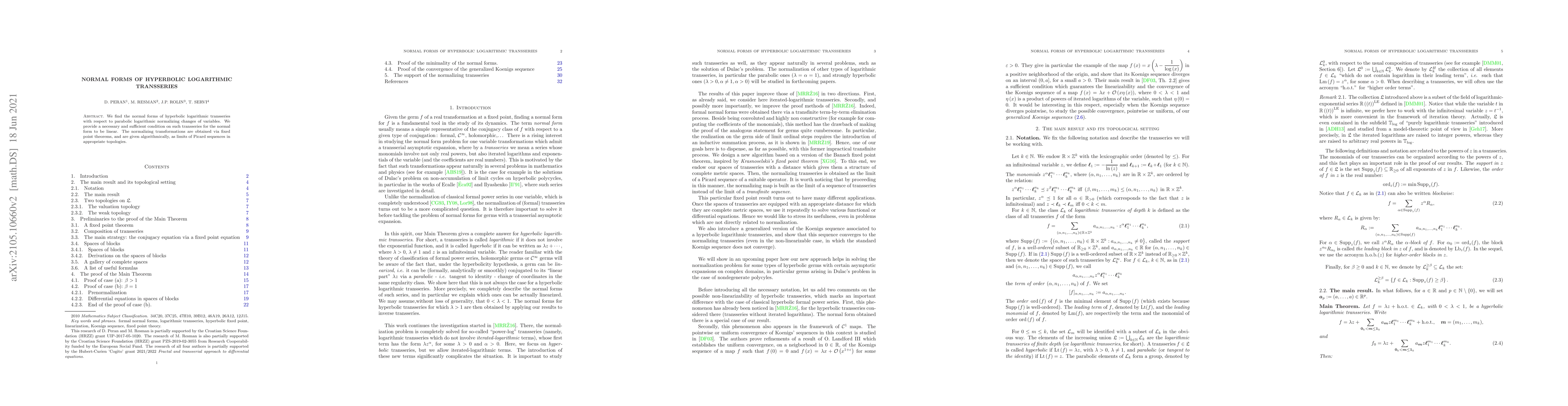 This paper determines the normal forms of hyperbolic logarithmic transseries under parabolic logarithmic transformations, providing a condition for linearity. The transformations are algorithmically derived using fixed point theorems and Picard sequences.