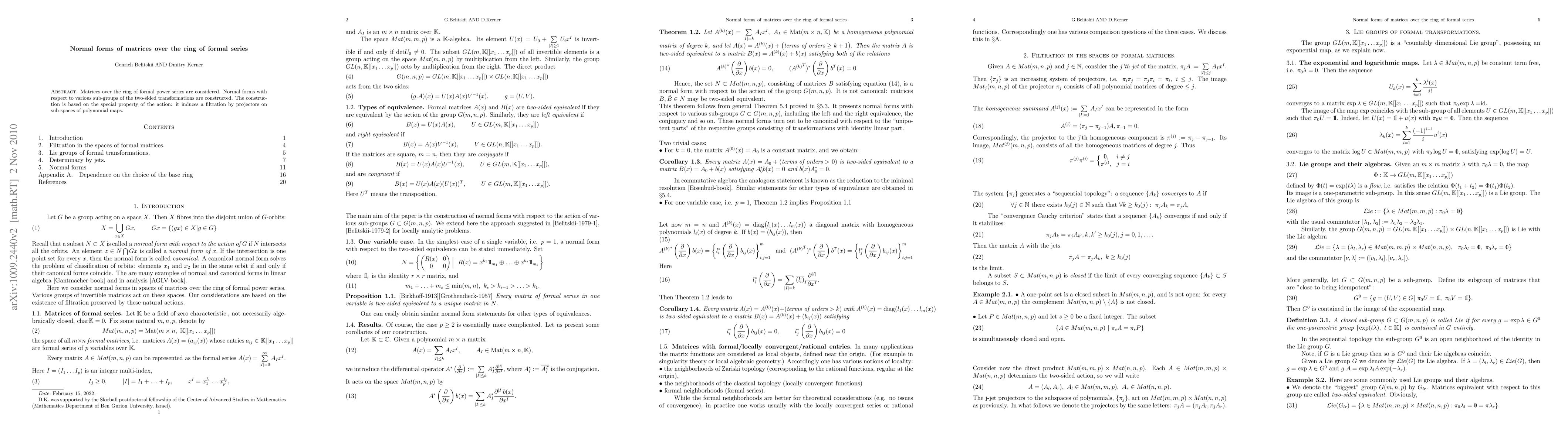 Matrices over the ring of formal power series are considered. Normal forms with respect to various sub-groups of the two-sided transformations are constructed. The construction is based on the special property of the action: it induces a filtration by projectors on sub-spaces of polynomial maps.
