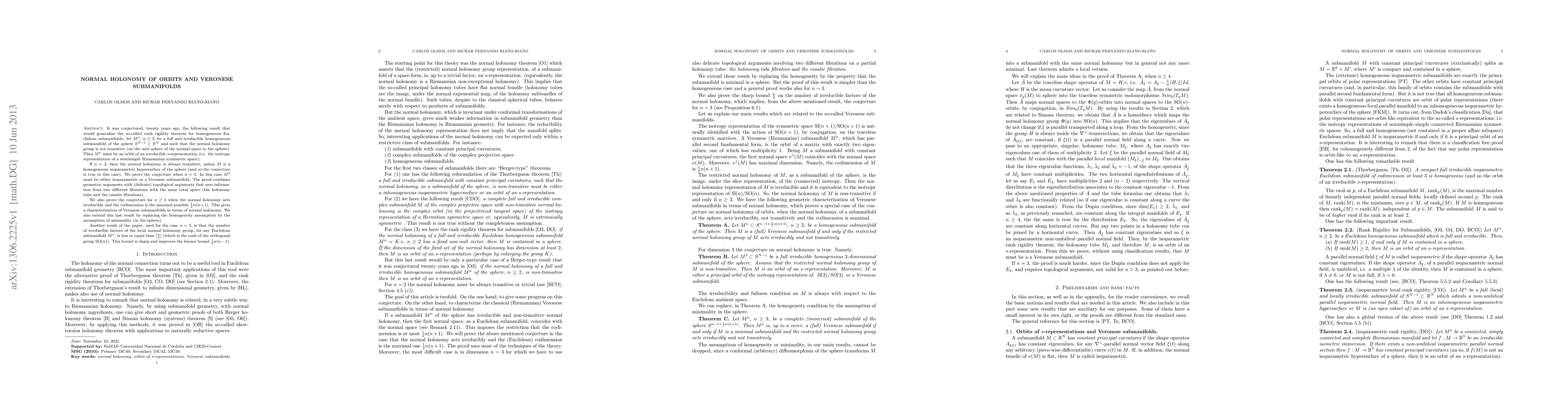 It was conjectured, twenty years ago, the following result that would generalize the so-called rank rigidity theorem for homogeneous Euclidean submanifolds: let M^n, n>=2, be a full and irreducible homogeneous submanifold of the sphere $S^{N-1}\subset R^N$ and such that the normal holonomy group is not transitive (on the unit sphere of the normal space to the sphere). Then M^n must be an orbit of an irreducible s-representation (i.e. the isotropy representation of a semisimple Riemannian symmetric space). If n=2, then the normal holonomy is always transitive, unless M is a homogeneous isoparametric hypersurface of the sphere (and so the conjecture is true in this case). We prove the conjecture when n=3. In this case M^3 must be either isoparametric or a Veronese submanifold. The proof combines geometric arguments with (delicate) topological arguments that uses information from two different fibrations with the same total space (the holonomy tube and the caustic fibrations). We also prove the conjecture for n>= 3 when the normal holonomy acts irreducibly and the codimension is the maximal possible n(n+1)/2. This gives a characterization of Veronese submanifolds in terms of normal holonomy. We also extend this last result by replacing the homogeneity assumption by the assumption of minimality (in the sphere). Another result of the paper, used for the case n=3, is that the number of irreducible factors of the local normal holonomy group, for any Euclidean submanifold M^n, is less or equal than [n/2] (which is the rank of the orthogonal group SO(n)). This bound is sharp and improves the known bound n(n-1)/2.