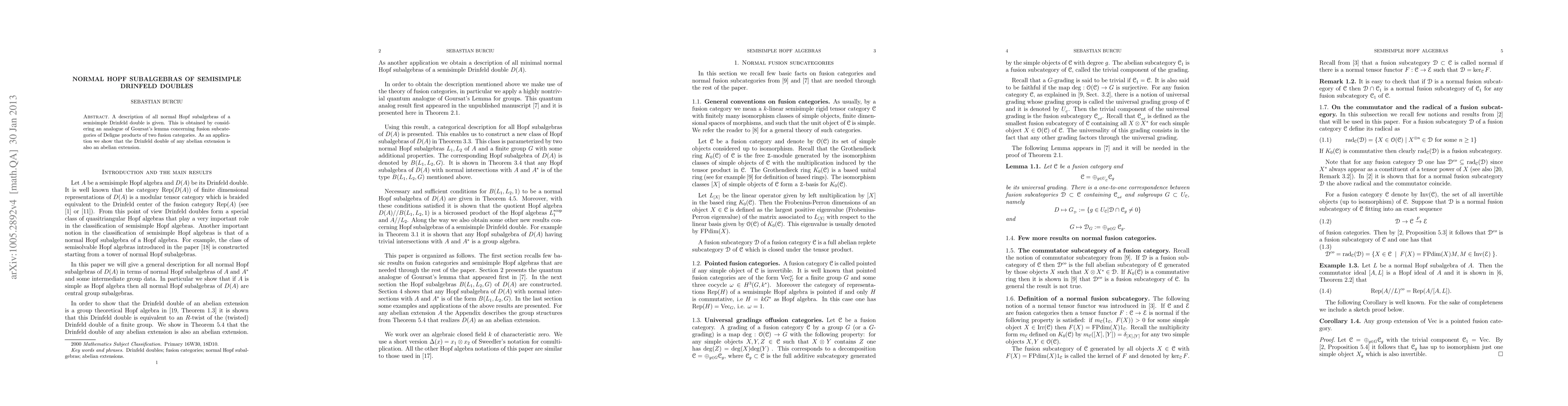 This paper identifies all normal Hopf subalgebras of semisimple Drinfeld doubles using an analogue of Goursat's lemma for fusion subcategories. It demonstrates that the Drinfeld double of any abelian extension remains an abelian extension.