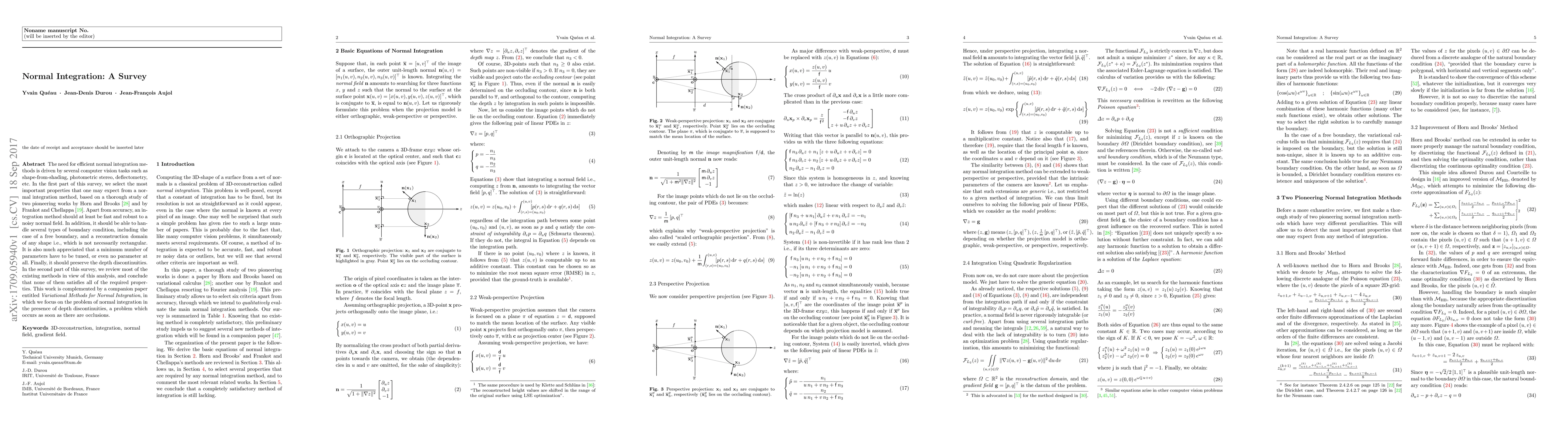 The need for efficient normal integration methods is driven by several computer vision tasks such as shape-from-shading, photometric stereo, deflectometry, etc. In the first part of this survey, we select the most important properties that one may expect from a normal integration method, based on a thorough study of two pioneering works by Horn and Brooks [28] and by Frankot and Chellappa [19]. Apart from accuracy, an integration method should at least be fast and robust to a noisy normal field. In addition, it should be able to handle several types of boundary condition, including the case of a free boundary, and a reconstruction domain of any shape i.e., which is not necessarily rectangular. It is also much appreciated that a minimum number of parameters have to be tuned, or even no parameter at all. Finally, it should preserve the depth discontinuities. In the second part of this survey, we review most of the existing methods in view of this analysis, and conclude that none of them satisfies all of the required properties. This work is complemented by a companion paper entitled Variational Methods for Normal Integration, in which we focus on the problem of normal integration in the presence of depth discontinuities, a problem which occurs as soon as there are occlusions.