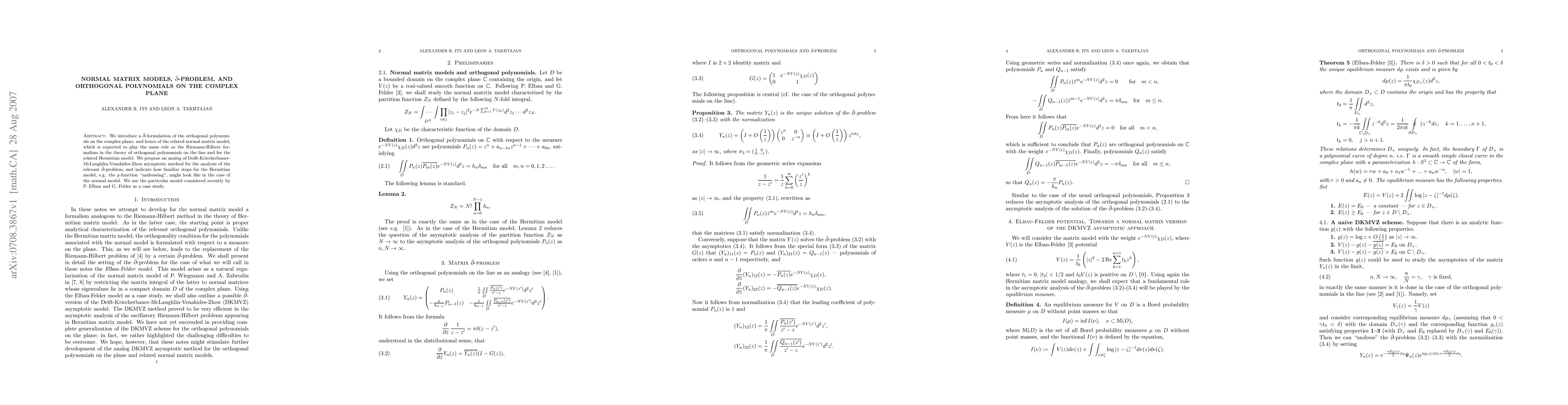 We introduce a dbar-formulation of the orthogonal polynomials on the complex plane, and hence of the related normal matrix model, which is expected to play the same role as the Riemann-Hilbert formalism in the theory of orthogonal polynomials on the line and for the related Hermitian model. We propose an analog of Deift-Kriecherbauer-McLaughlin-Venakides-Zhou asymptotic method for the analysis of the relevant dbar-problem, and indicate how familiar steps for the Hermitian model, e.g. the g-function ``undressing'', might look like in the case of the normal model. We use the particular model considered recently by P. Elbau and G. Felder as a case study.