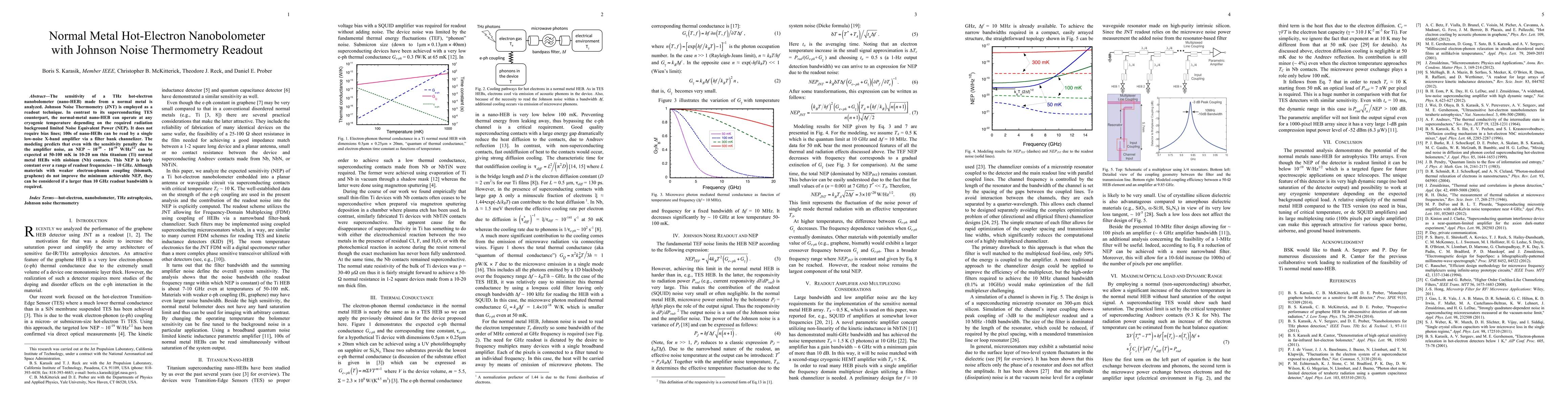 The sensitivity of a THz hot-electron nanobolometer (nano-HEB) made from a normal metal is analyzed. Johnson Noise Thermometry (JNT) is employed as a readout technique. In contrast to its superconducting TES counterpart, the normal-metal nano-HEB can operate at any cryogenic temperature depending on the required radiation background limited Noise Equivalent Power (NEP). It does not require bias lines; 100s of nano-HEBs can be read by a single low-noise X-band amplifier via a filter bank channelizer. The modeling predicts that even with the sensitivity penalty due to the amplifier noise, an NEP ~ 10$^{-20}$ - 10$^{-19}$ W/Hz$^{1/2}$ can be expected at 50-100 mK in 10-20 nm thin titanium (Ti) normal metal HEBs with niobium (Nb) contacts. This NEP is fairly constant over a range of readout frequencies ~ 10 GHz. Although materials with weaker electron-phonon coupling (bismuth, graphene) do not improve the minimum achievable NEP, they can be considered if a larger than 10 GHz readout bandwidth is required.