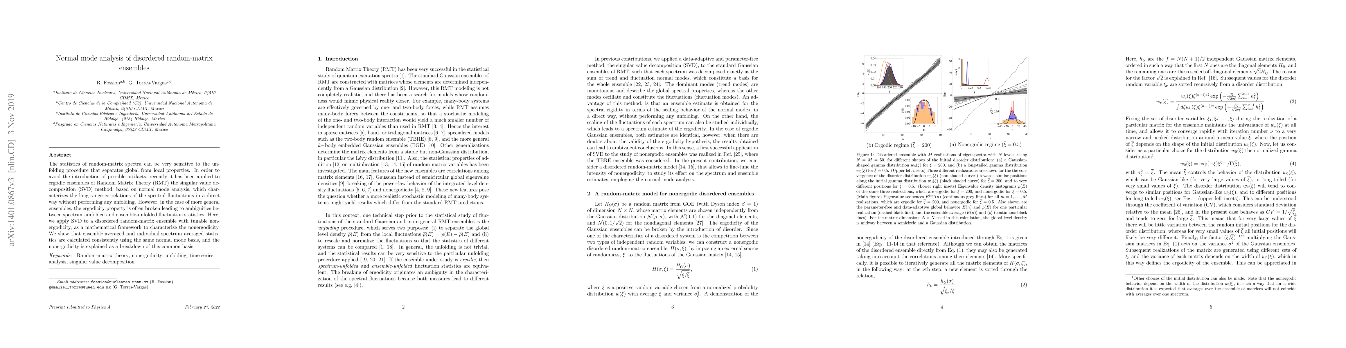 This paper applies singular value decomposition (SVD) based on normal mode analysis to disordered random-matrix ensembles to characterize long-range spectral correlations without unfolding. It demonstrates that SVD can consistently calculate ensemble-averaged and individual-spectrum averaged statistics, revealing nonergodicity as a breakdown of the common normal mode basis.