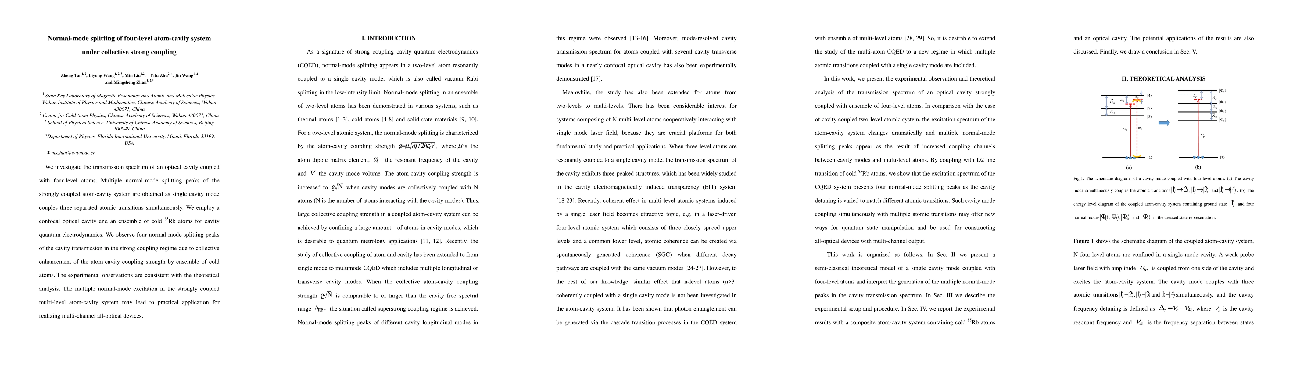 This research explores the transmission spectrum of a four-level atom-cavity system under strong coupling, revealing multiple normal-mode splitting peaks due to collective enhancement from an ensemble of cold Rb-85 atoms. The findings suggest potential applications for multi-channel all-optical devices.