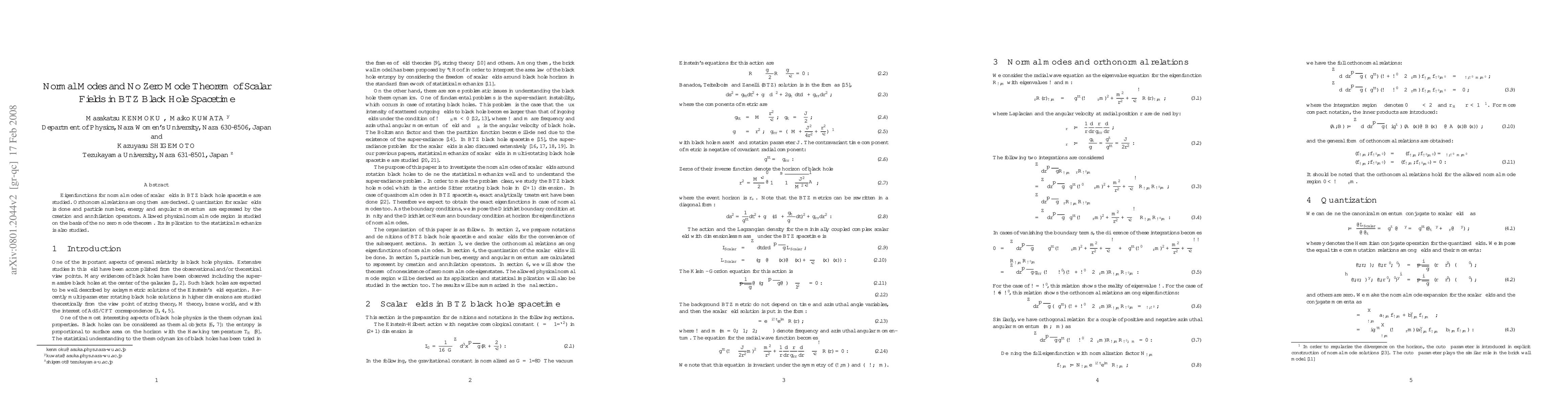 This paper investigates the normal modes of scalar fields in BTZ black hole spacetime, deriving orthonormal relations and quantizing the fields using creation and annihilation operators. It establishes a no zero mode theorem and discusses its implications for statistical mechanics.