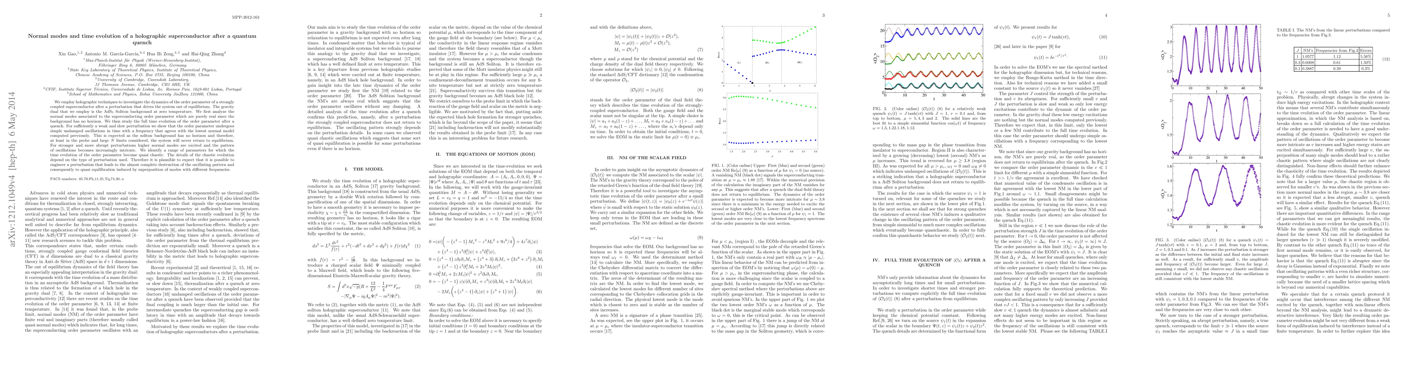 We employ holographic techniques to investigate the dynamics of the order parameter of a strongly coupled superconductor after a perturbation that drives the system out of equilibrium. The gravity dual that we employ is the ${\rm AdS}_5$ Soliton background at zero temperature. We first analyze the normal modes associated to the superconducting order parameter which are purely real since the background has no horizon. We then study the full time evolution of the order parameter after a quench. For sufficiently a weak and slow perturbation we show that the order parameter undergoes simple undamped oscillations in time with a frequency that agrees with the lowest normal model computed previously. This is expected as the soliton background has no horizon and therefore, at least in the probe and large $N$ limits considered, the system will never return to equilibrium. For stronger and more abrupt perturbations higher normal modes are excited and the pattern of oscillations becomes increasingly intricate. We identify a range of parameters for which the time evolution of the order parameter become quasi chaotic. The details of the chaotic evolution depend on the type of perturbation used. Therefore it is plausible to expect that it is possible to engineer a perturbation that leads to the almost complete destruction of the oscillating pattern and consequently to quasi equilibration induced by superposition of modes with different frequencies.
