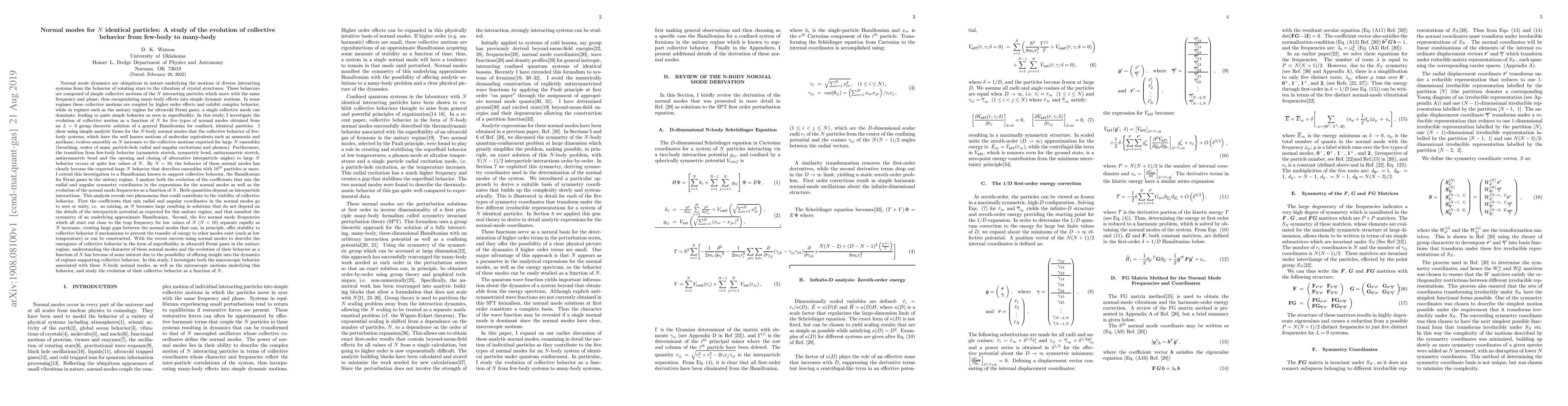 Normal mode dynamics are ubiquitous underlying the motions of diverse systems from rotating stars to crystal structures. These behaviors are composed of simple collective motions of particles which move with the same frequency and phase, thus encapsulating many-body effects into simple dynamic motions. In regimes such as the unitary regime for ultracold Fermi gases, a single collective mode can dominate, leading to simple behavior as seen in superfluidity. I investigate the evolution of collective motion as a function of N for five types of normal modes obtained from an L=0 group theoretic solution of a general Hamiltonian for confined, identical particles. I show using simple analytic forms that the collective behavior of few-body systems, with the well known motions of molecular equivalents such as ammonia and methane, evolves smoothly to the collective motions expected for large N ensembles. The transition occurs at quite low values of N. I study a Hamiltonian known to support collective behavior, the Hamiltonian for Fermi gases in the unitary regime. I analyze the evolution of both frequencies and the coefficients that mix the radial and angular coordinates which both depend on interparticle interactions. This analysis reveals two phenomena that could contribute to the viability of collective behavior. First the mixing coefficients go to zero or unity, i.e. no mixing, as N becomes large resulting in solutions that do not depend on the details of the interparticle potential as expected for this unitary regime, and that manifest the symmetry of an underlying approximate Hamiltonian. Second, the five normal mode frequencies which are all close for low values of N, separate as N increases, creating large gaps that can, in principle, offer stability to collective behavior if mechanisms to prevent the transfer of energy to other modes exist (such as low temperature) or can be constructed.