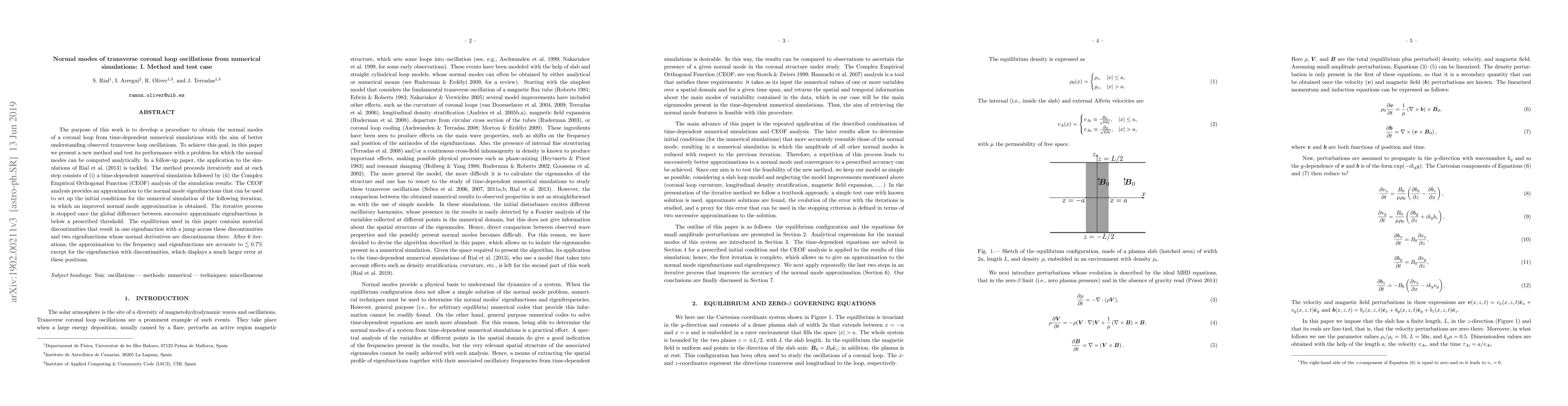 The purpose of this work is to develop a procedure to obtain the normal modes of a coronal loop from time-dependent numerical simulations with the aim of better understanding observed transverse loop oscillations. To achieve this goal, in this paper we present a new method and test its performance with a problem for which the normal modes can be computed analytically. In a follow-up paper, the application to the simulations of \citet{rial2013} is tackled. The method proceeds iteratively and at each step consists of (i) a time-dependent numerical simulation followed by (ii) the Complex Empirical Orthogonal Function (CEOF) analysis of the simulation results. The CEOF analysis provides an approximation to the normal mode eigenfunctions that can be used to set up the initial conditions for the numerical simulation of the following iteration, in which an improved normal mode approximation is obtained. The iterative process is stopped once the global difference between successive approximate eigenfunctions is below a prescribed threshold. The equilibrium used in this paper contains material discontinuities that result in one eigenfunction with a jump across these discontinuities and two eigenfunctions whose normal derivatives are discontinuous there. After 6 iterations, the approximation to the frequency and eigenfunctions are accurate to $\lesssim 0.7$\% except for the eigenfunction with discontinuities, which displays a much larger error at these positions.