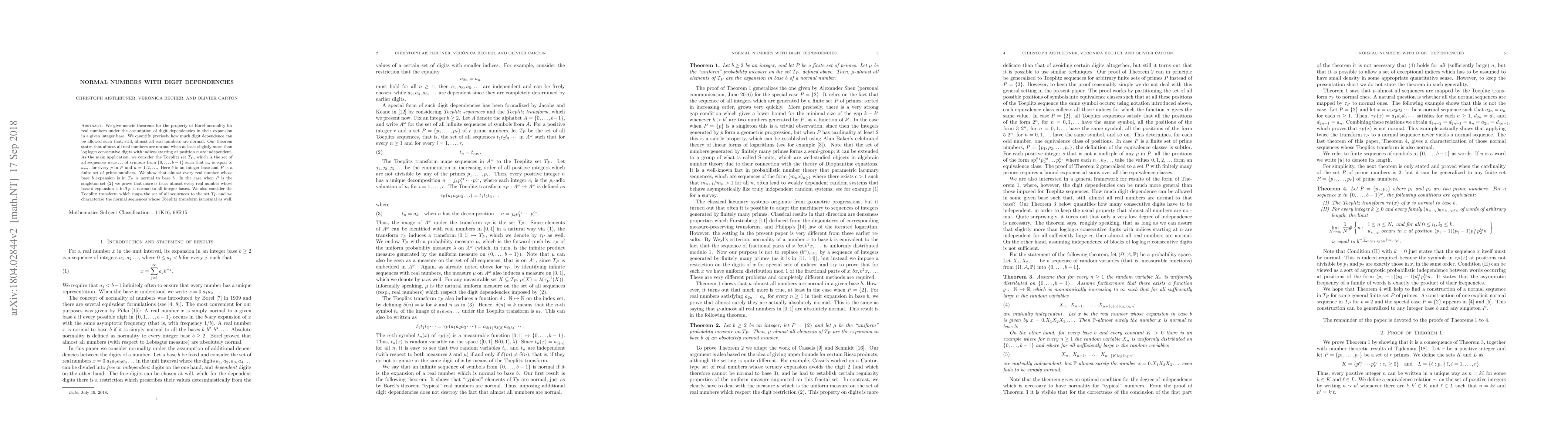 This paper presents metric theorems for Borel normality of real numbers, quantifying digit dependencies in base expansions. Almost all real numbers remain normal with slight independence of more than log-log n consecutive digits. The study extends to the Toeplitz set T_P, showing almost every real with base-b expansion in T_P is normal to base b. For P as {2}, these numbers are normal to all integer bases. The paper also characterizes normal sequences whose Toeplitz transform remains normal.