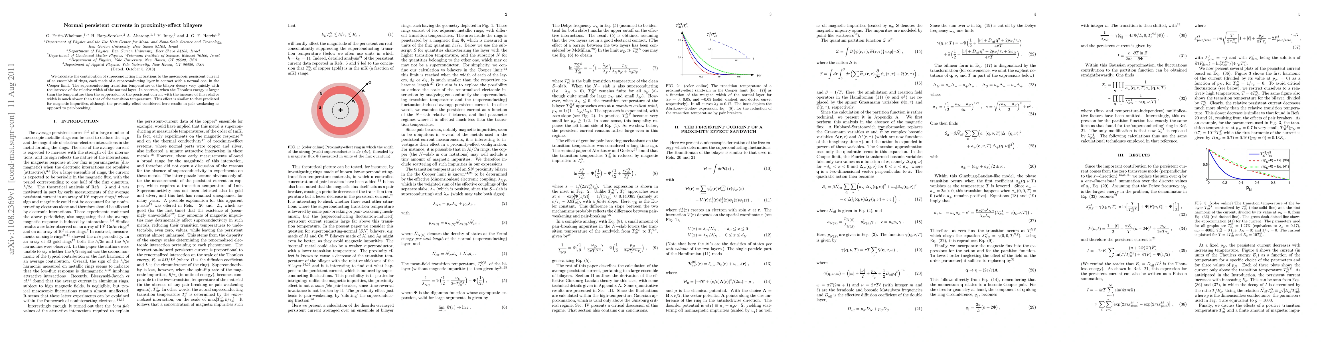 We calculate the contribution of superconducting fluctuations to the mesoscopic persistent current of an ensemble of rings, each made of a superconducting layer in contact with a normal one, in the Cooper limit. The superconducting transition temperature of the bilayer decays very quickly with the increase of the relative width of the normal layer. In contrast, when the Thouless energy is larger than the temperature then the suppression of the persistent current with the increase of this relative width is much slower than that of the transition temperature. This effect is similar to that predicted for magnetic impurities, although the proximity effect considered here results in pair-weakening as opposed to pair-breaking.