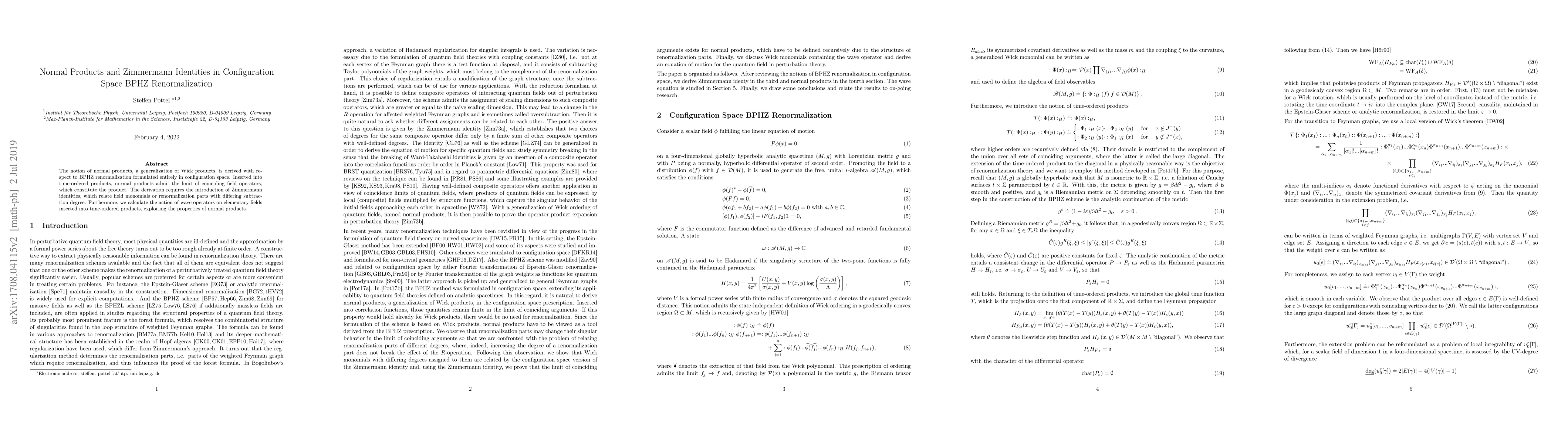 This paper explores the derivation of normal products in the context of BPHZ renormalization using configuration space, introducing Zimmermann identities to link field monomials. It also examines the effect of wave operators on elementary fields within time-ordered products, leveraging the properties of normal products.