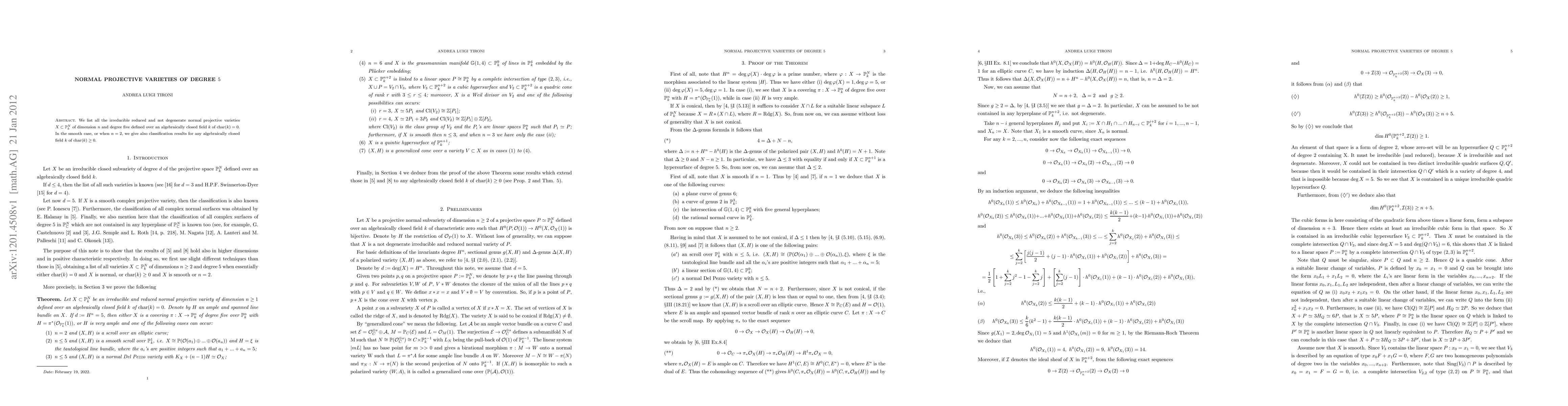 We list the irreducible reduced and not degenerate normal projective varieties $X\subset\mathbb{P}^N$ of dimension $n$ and degree five defined over an algebraically closed field $k$ of char$(k) = 0$. In the smooth case, or when $n = 2$, we give also classification results for any algebraically closed field $k$ of char$(k) \geq 0$.