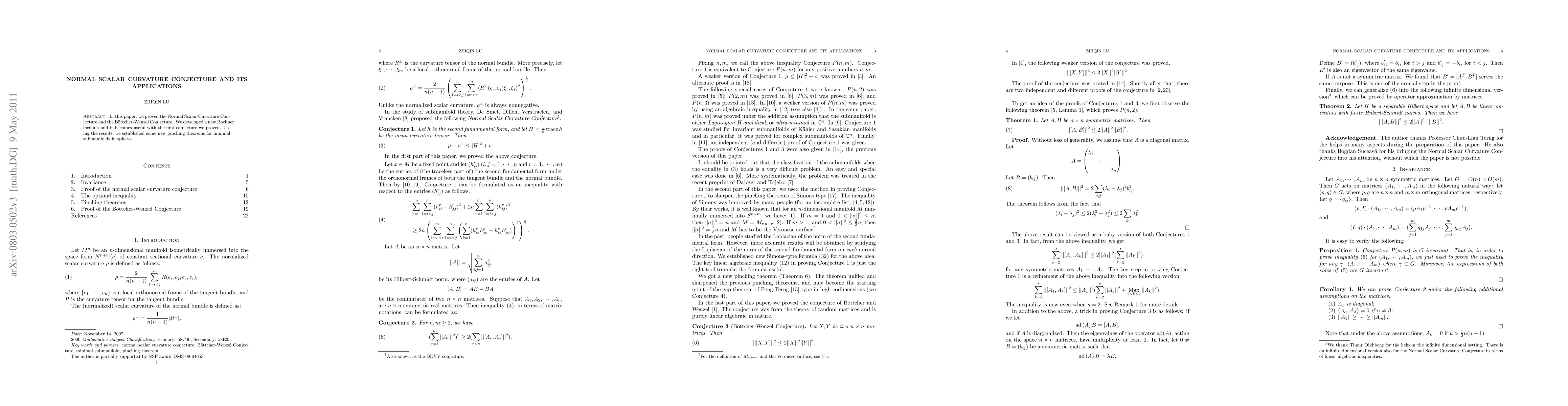 In this paper, we proved the Normal Scalar Curvature Conjecture and the Bottcher-Wenzel Conjecture. We also established some new pinching theorems for minimal submanifolds in spheres.