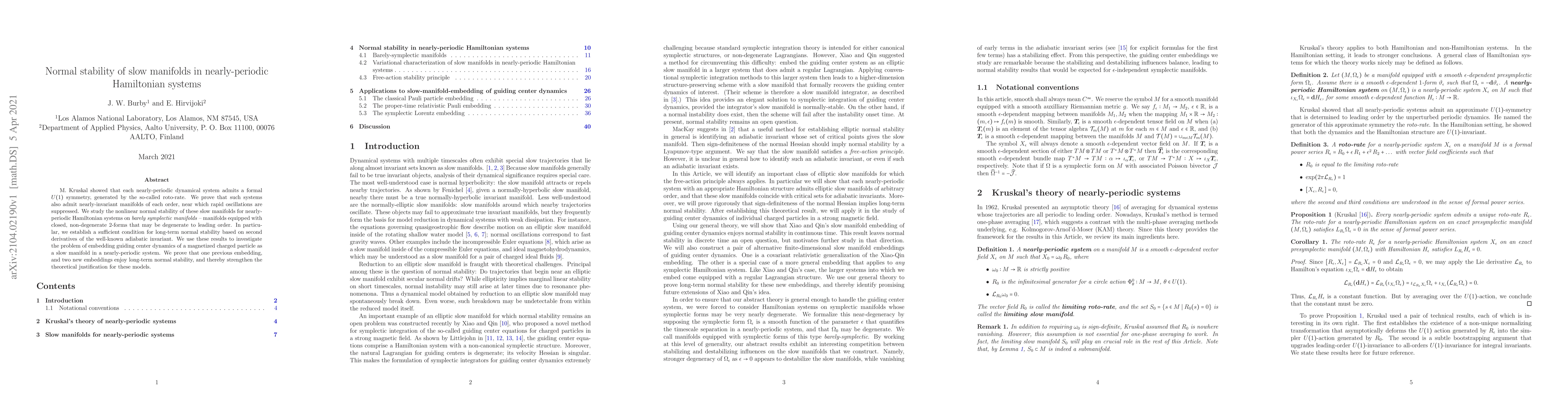 M. Kruskal showed that each nearly-periodic dynamical system admits a formal $U(1)$ symmetry, generated by the so-called roto-rate. We prove that such systems also admit nearly-invariant manifolds of each order, near which rapid oscillations are suppressed. We study the nonlinear normal stability of these slow manifolds for nearly-periodic Hamiltonian systems on barely symplectic manifolds -- manifolds equipped with closed, non-degenerate $2$-forms that may be degenerate to leading order. In particular, we establish a sufficient condition for long-term normal stability based on second derivatives of the well-known adiabatic invariant. We use these results to investigate the problem of embedding guiding center dynamics of a magnetized charged particle as a slow manifold in a nearly-periodic system. We prove that one previous embedding, and two new embeddings enjoy long-term normal stability, and thereby strengthen the theoretical justification for these models.