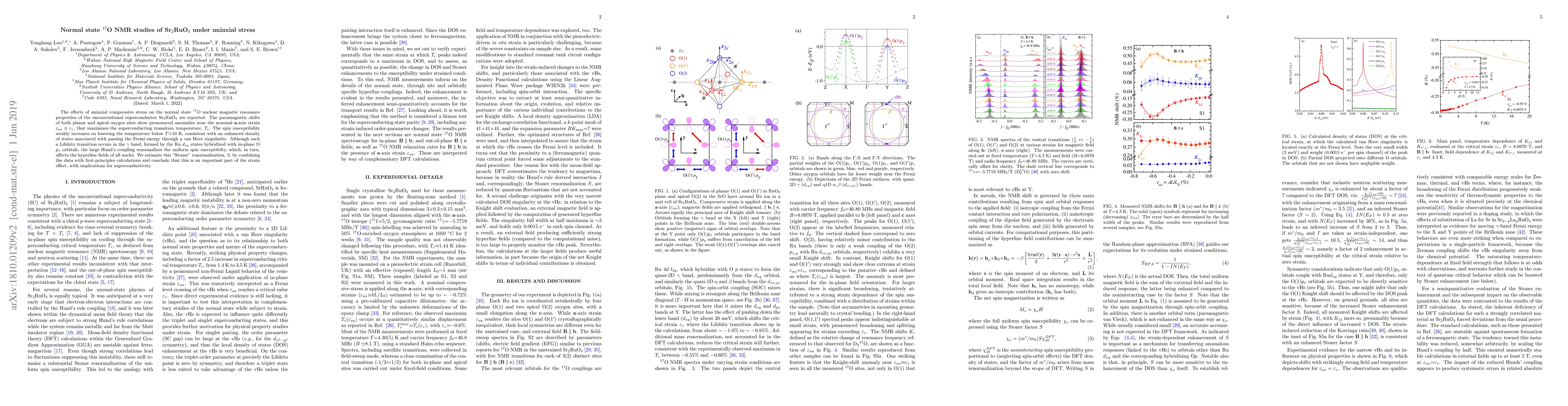 The research investigates the impact of uniaxial stress on the superconductor Sr2RuO4 using $^{17}$O NMR. Notable findings include pronounced anomalies in paramagnetic shifts near the strain maximizing superconducting temperature. A Lifshitz transition in the Ru dxy-O pπ hybridized band is identified, linked to a van Hove singularity. The study attributes the effect to Hund's coupling renormalization, estimating it through first-principles calculations, suggesting significant implications for the material's superconductivity.