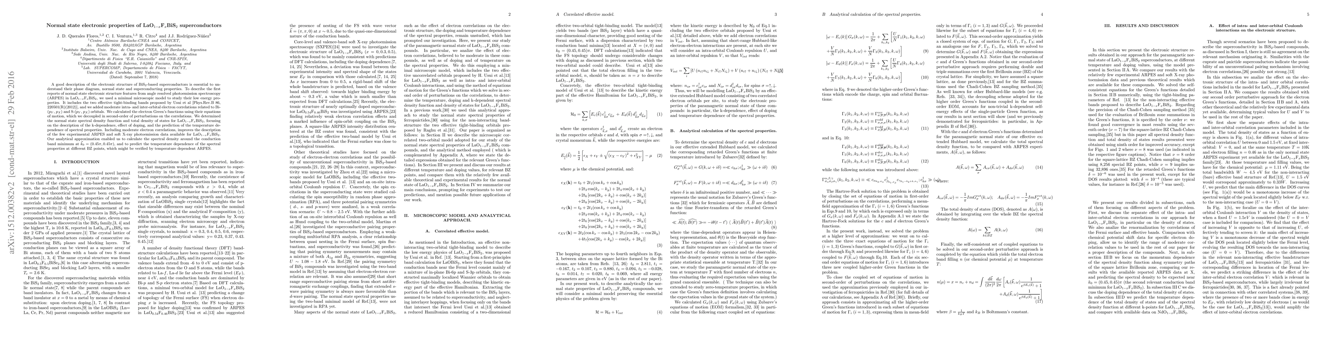 This paper uses a minimal microscopic model to analyze the normal state electronic properties of LaO$_{1-x}$F$_{x}$BiS$_{2}$ superconductors, incorporating moderate electron correlations. The study reveals the k-dependence, doping effects, and temperature-dependent spectral properties, improving the description of experimental ARPES data.