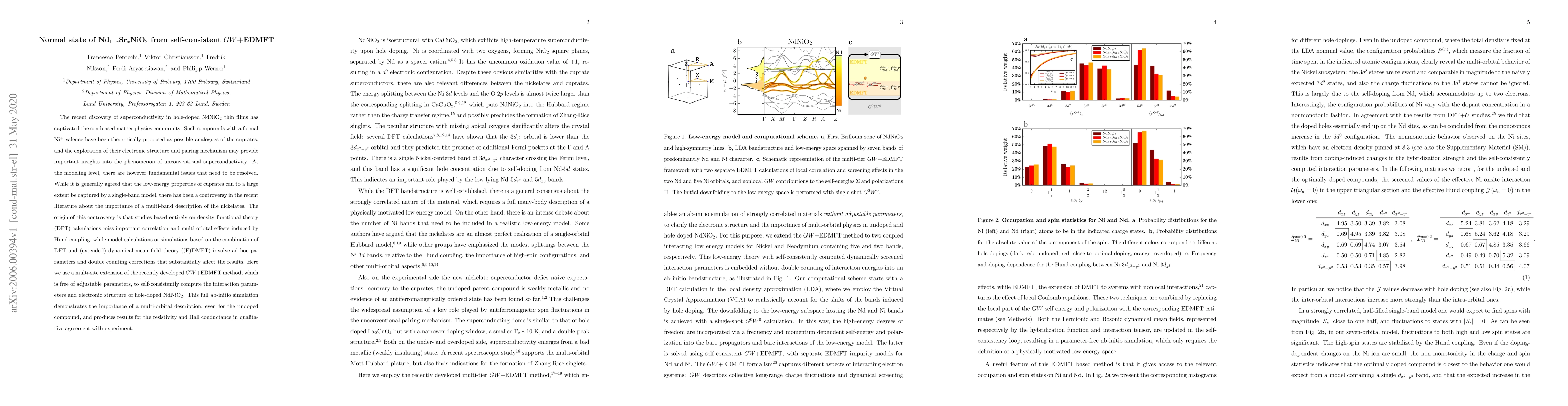 The recent discovery of superconductivity in hole-doped NdNiO$_2$ thin films has captivated the condensed matter physics community. Such compounds with a formal Ni$^+$ valence have been theoretically proposed as possible analogues of the cuprates, and the exploration of their electronic structure and pairing mechanism may provide important insights into the phenomenon of unconventional superconductivity. At the modeling level, there are however fundamental issues that need to be resolved. While it is generally agreed that the low-energy properties of cuprates can to a large extent be captured by a single-band model, there has been a controversy in the recent literature about the importance of a multi-band description of the nickelates. The origin of this controversy is that studies based entirely on density functional theory (DFT) calculations miss important correlation and multi-orbital effects induced by Hund coupling, while model calculations or simulations based on the combination of DFT and (extended) dynamical mean field theory ((E)DMFT) involve ad-hoc parameters and double counting corrections that substantially affect the results. Here we use a multi-site extension of the recently developed $GW$+EDMFT method, which is free of adjustable parameters, to self-consistently compute the interaction parameters and electronic structure of hole-doped NdNiO$_2$. This full ab-initio simulation demonstrates the importance of a multi-orbital description, even for the undoped compound, and produces results for the resistivity and Hall conductance in qualitative agreement with experiment.