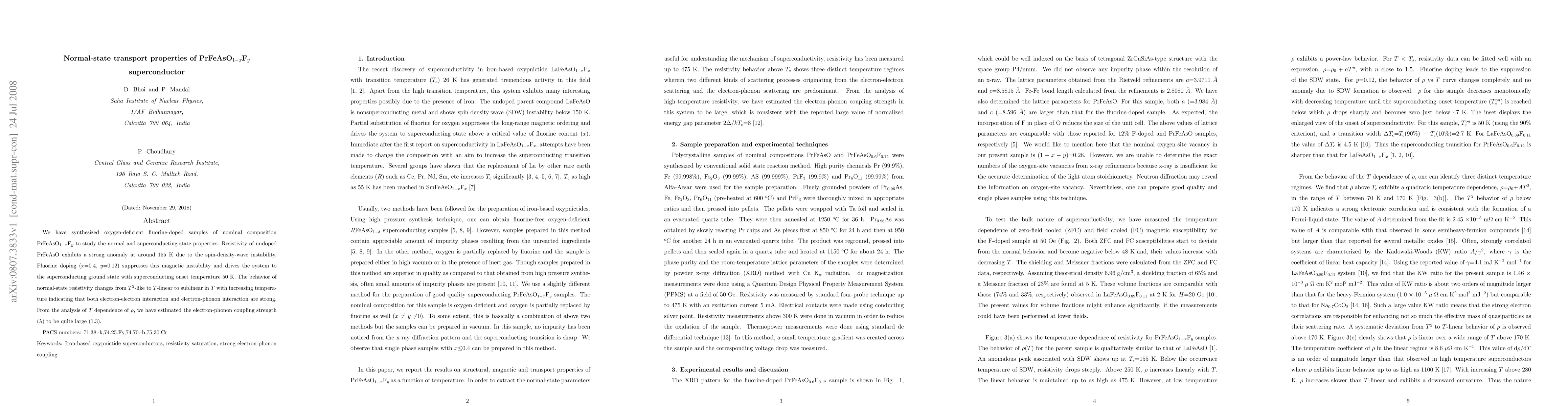 We have synthesized oxygen-deficient fluorine-doped samples of nominal composition PrFeAsO$_{1-x}$F$_y$ to study the normal and superconducting state properties. Resistivity of undoped PrFeAsO exhibits a strong anomaly at around 155 K due to the spin-density-wave instability. Fluorine doping ($x$=0.4, $y$=0.12) suppresses this magnetic instability and drives the system to the superconducting ground state with superconducting onset temperature 50 K. The behavior of normal-state resistivity changes from $T^2$-like to $T$-linear to sublinear in $T$ with increasing temperature indicating that both electron-electron interaction and electron-phonon interaction are strong. From the analysis of $T$ dependence of $\rho$, we have estimated the electron-phonon coupling strength ($\lambda$) to be quite large (1.3).