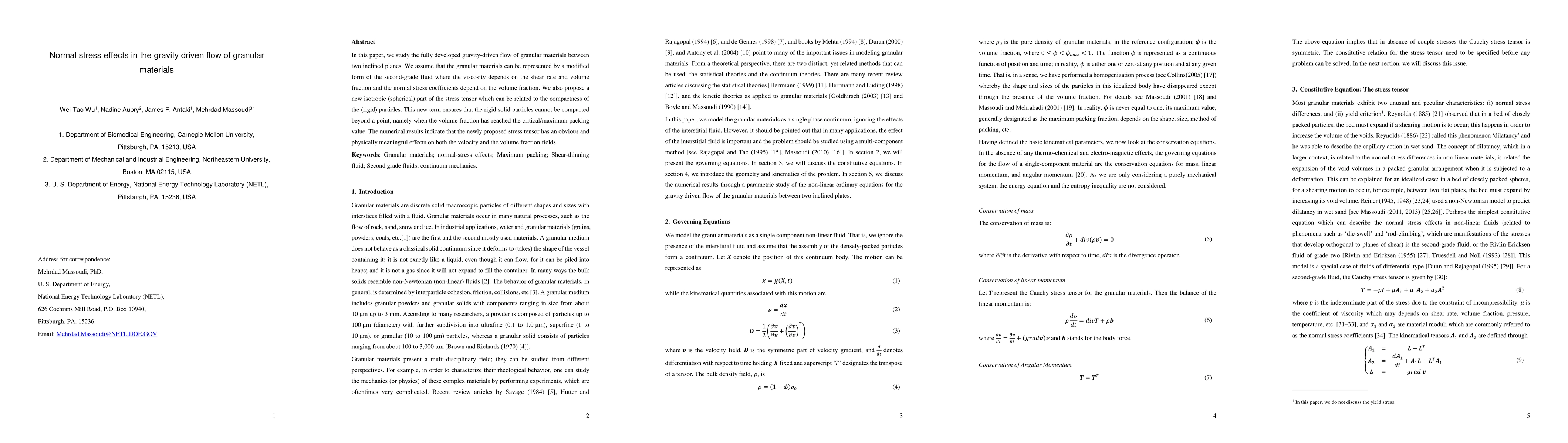 This paper investigates gravity-driven granular flow between inclined planes using a modified second-grade fluid model, introducing a new isotropic stress tensor that accounts for particle compactness. The results show significant effects on velocity and volume fraction fields due to the proposed stress tensor.