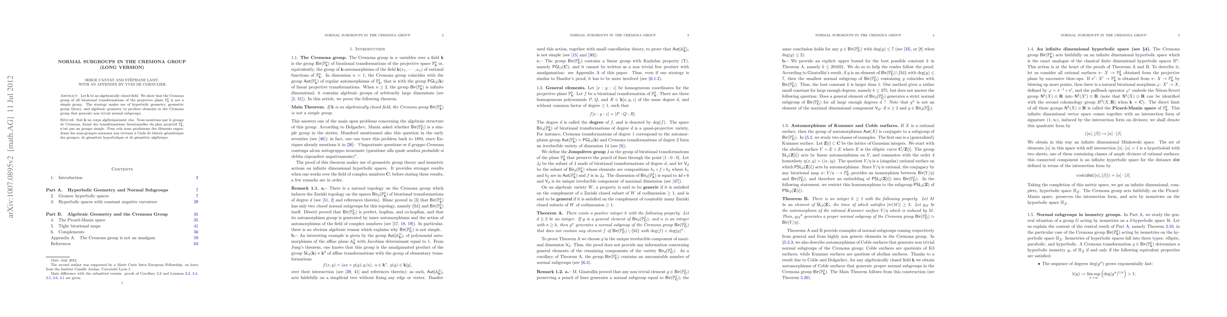 Summary: The paper demonstrates that the Cremona group of birational transformations of P^2 over an algebraically closed field k is not simple by constructing nontrivial normal subgroups using methods from hyperbolic geometry, geometric group theory, and algebraic geometry.