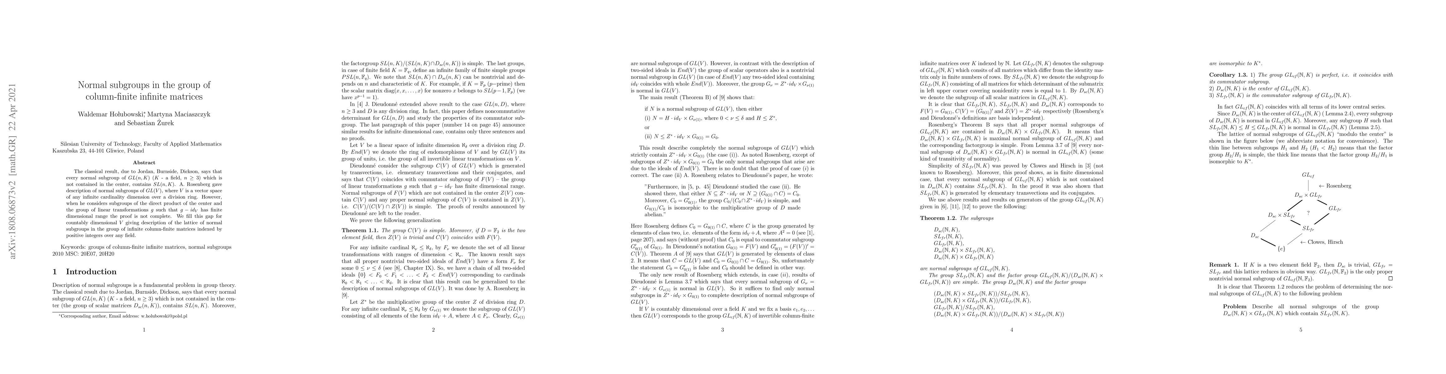 This paper completes a proof by Rosenberg regarding normal subgroups in the group of column-finite infinite matrices, providing a detailed description of the lattice of such normal subgroups for countably dimensional vector spaces over any field.