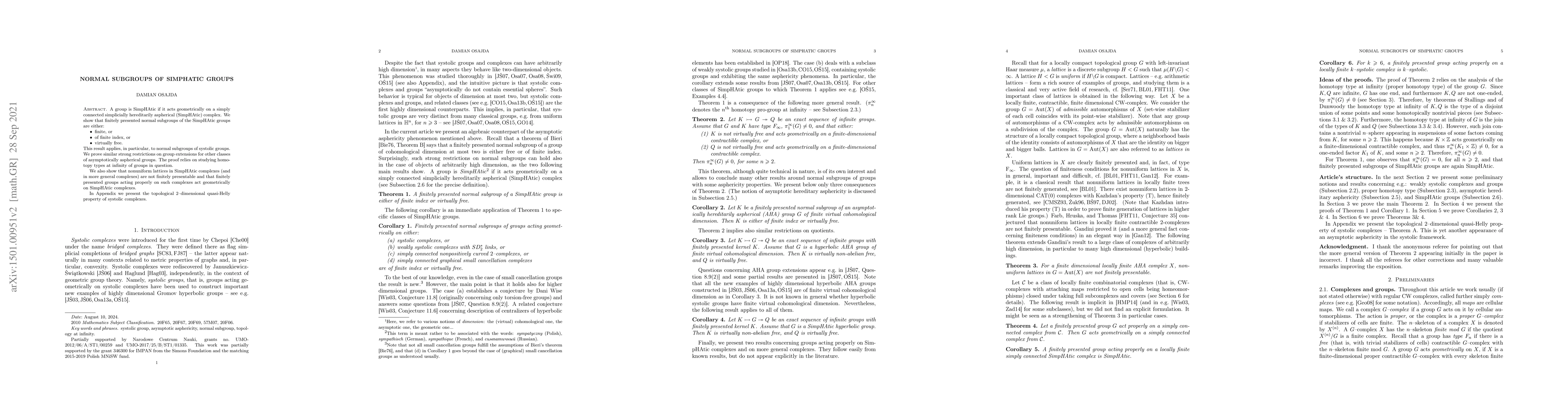 A group is SimpHAtic if it acts geometrically on a simply connected simplicially hereditarily aspherical (SimpHAtic) complex. We show that finitely presented normal subgroups of the SimpHAtic groups are either: finite, or of finite index, or virtually free. This result applies, in particular, to normal subgroups of systolic groups. We prove similar strong restrictions on group extensions for other classes of asymptotically aspherical groups. The proof relies on studying homotopy types at infinity of groups in question. We also show that nonuniform lattices in SimpHAtic complexes (and in more general complexes) are not finitely presentable and that finitely presented groups acting properly on such complexes act geometrically on SimpHAtic complexes.