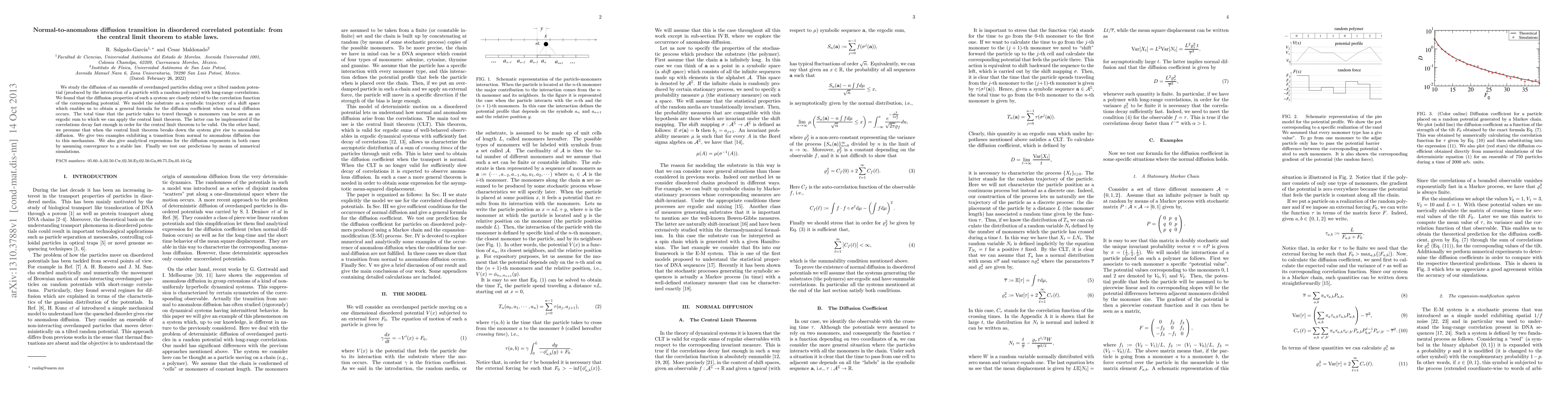 This paper investigates the diffusion behavior of particles over disordered, long-range correlated potentials, showing that normal diffusion transitions to anomalous diffusion when the central limit theorem fails due to slow decay of correlations. Analytical expressions for diffusion exponents and numerical simulations validate the transition model.