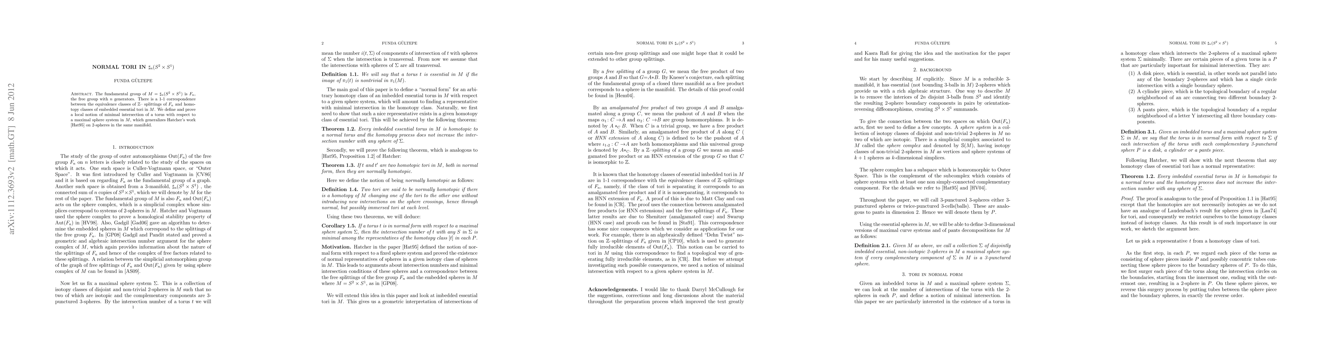 The paper establishes a 1-1 correspondence between $\mathbb{Z}$-splittings of the free group $F_n$ and homotopy classes of essential tori in $M=\sharp_n (S^2\times S^1)$. It introduces a local minimal intersection concept for tori, extending Hatcher's results on 2-spheres.