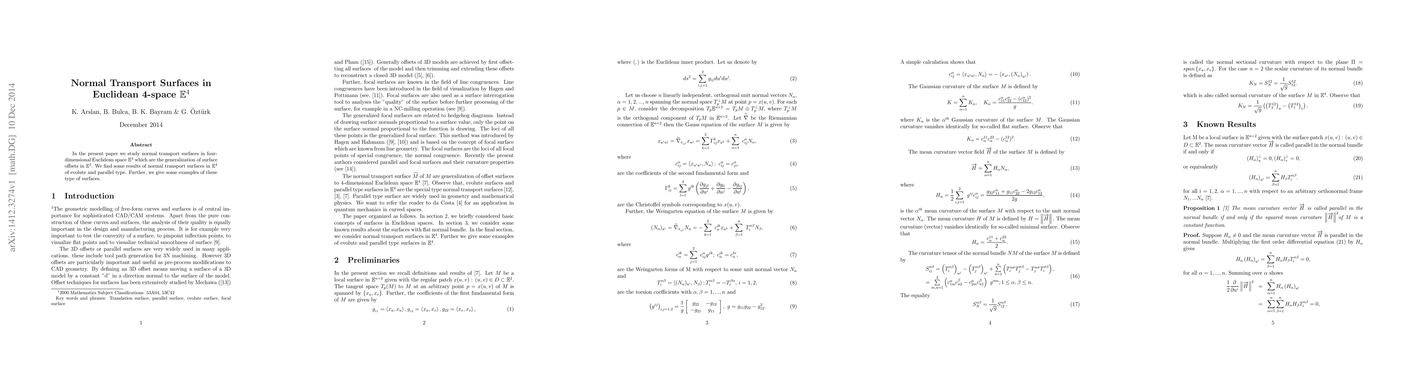 In the present paper we study normal transport surfaces in four-dimensional Euclidean space $\mathbb{E}^{4}$ which are the generalization of surface offsets in $\mathbb{E}^{3}$. We find some results of normal transport surfaces in $\mathbb{E}^{4}$ of evolute and parallel type. Further, we give some examples of these type of surfaces.