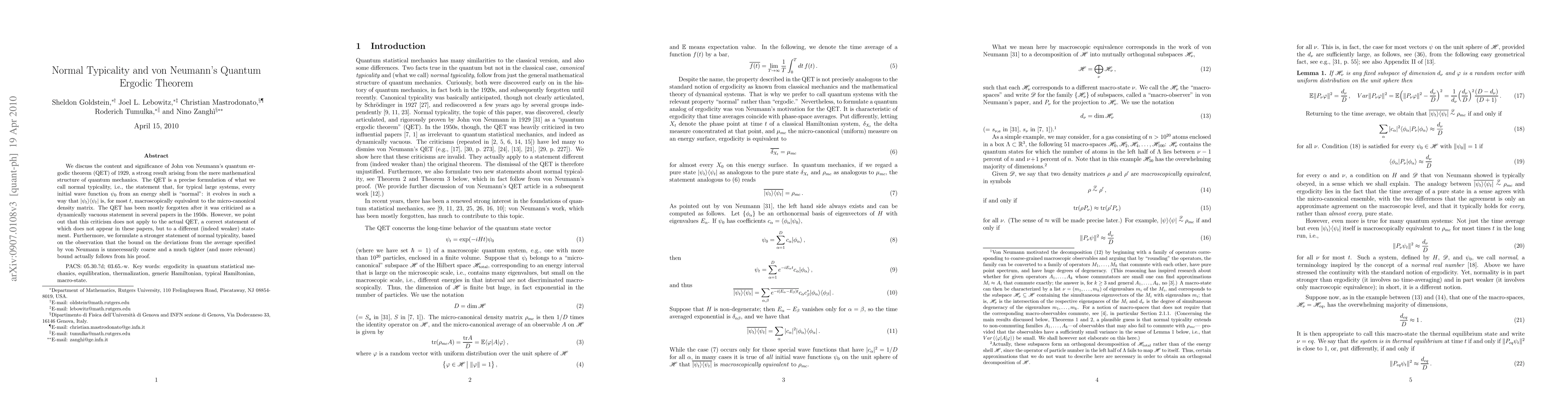 We discuss the content and significance of John von Neumann's quantum ergodic theorem (QET) of 1929, a strong result arising from the mere mathematical structure of quantum mechanics. The QET is a precise formulation of what we call normal typicality, i.e., the statement that, for typical large systems, every initial wave function $\psi_0$ from an energy shell is "normal": it evolves in such a way that $|\psi_t> <\psi_t|$ is, for most $t$, macroscopically equivalent to the micro-canonical density matrix. The QET has been mostly forgotten after it was criticized as a dynamically vacuous statement in several papers in the 1950s. However, we point out that this criticism does not apply to the actual QET, a correct statement of which does not appear in these papers, but to a different (indeed weaker) statement. Furthermore, we formulate a stronger statement of normal typicality, based on the observation that the bound on the deviations from the average specified by von Neumann is unnecessarily coarse and a much tighter (and more relevant) bound actually follows from his proof.