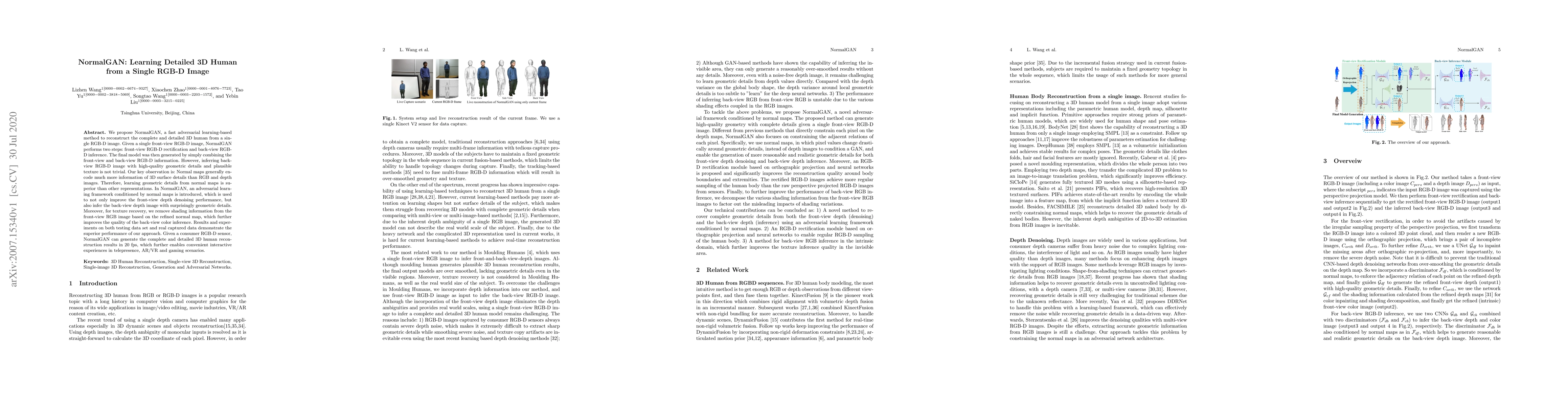 NormalGAN reconstructs detailed 3D human models from single RGB-D images using adversarial learning conditioned on normal maps, achieving high-quality geometric details and plausible textures. The method combines front-view and back-view RGB-D information for complete 3D human reconstruction, enabling interactive experiences in telepresence, AR/VR, and gaming.