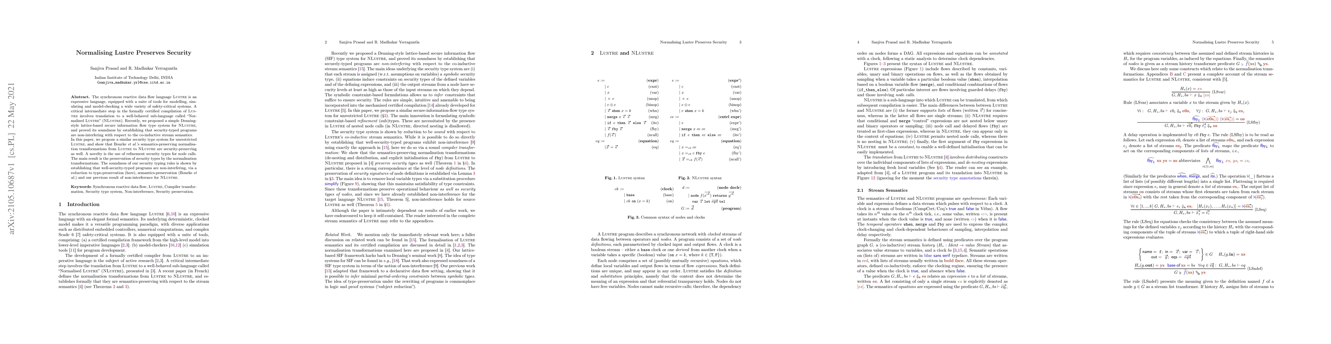 This paper proposes a security type system for the LUSTRE language, demonstrating that its normalisation transformations to a well-behaved sub-language preserve security. It uses refinement security types for node calls and proves that well-security-typed programs are non-interfering, building on previous results for the normalised sub-language.