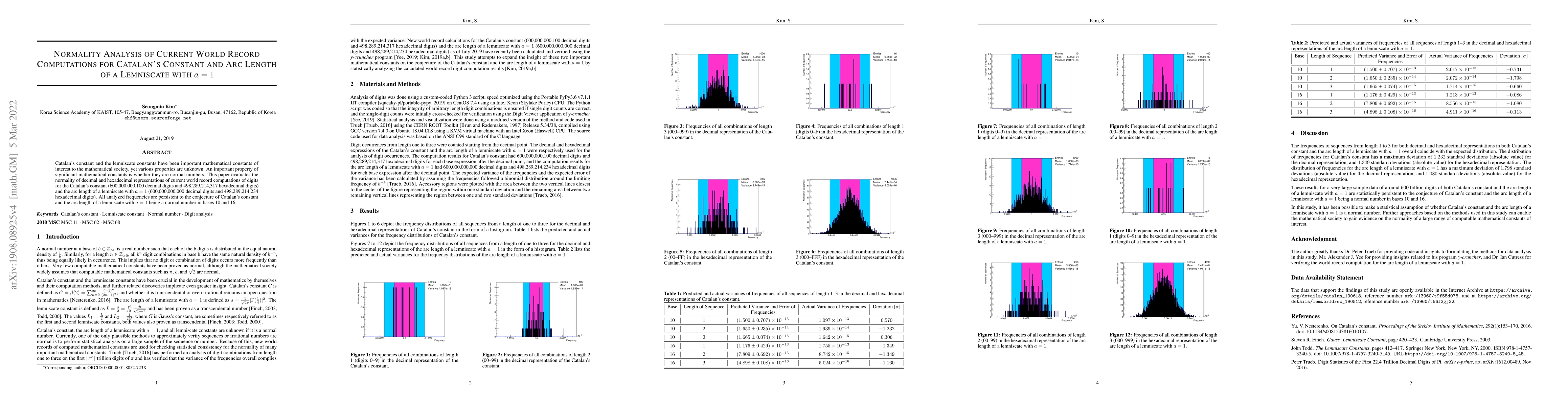 The study statistically analyzed the world record digit computation results for Catalan's constant and the arc length of a lemniscate with a=1 using custom-coded Python3 scripts, optimized with PortablePyPy3.6v7.1.1, on CentOS7.4 with an Intel Xeon (Skylake Purley) CPU. Statistical analysis and visualization were done using a modified method and code from Trueb with CERN ROOT Toolkit Release 5.34/38, compiled using GCC version 7.4.0 on Ubuntu 18.04 LTS.