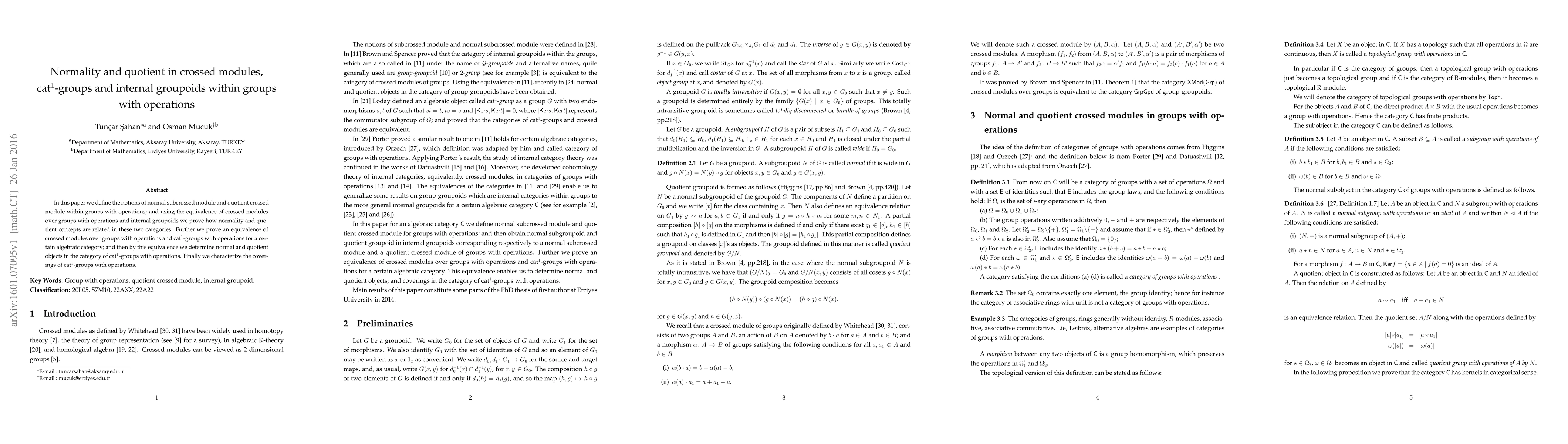 This paper defines normal subcrossed modules and quotient crossed modules within groups with operations, proving their equivalence to internal groupoids. It establishes an equivalence between crossed modules and cat$^1$-groups with operations, thereby determining normal and quotient objects in the cat$^1$-group category and characterizing their coverings.