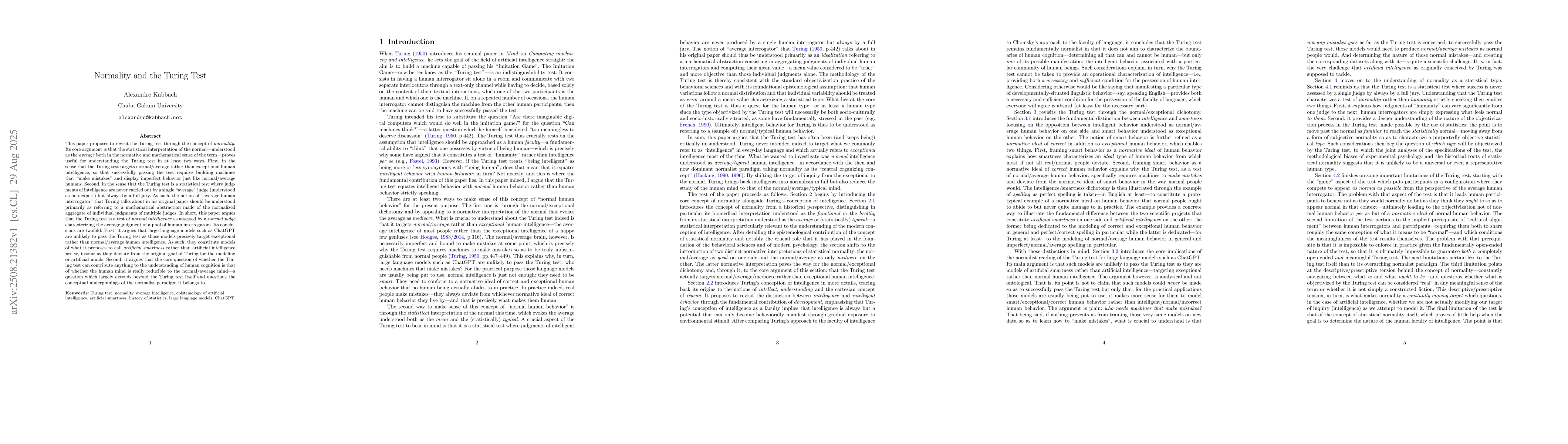 This paper proposes to revisit the Turing test through the concept of normality. Its core argument is that the statistical interpretation of the normal--understood as the average both in the normative and mathematical sense of the term--proves useful for understanding the Turing test in at least two ways. First, in the sense that the Turing test targets normal/average rather than exceptional human intelligence, so that successfully passing the test requires building machines that "make mistakes" and display imperfect behavior just like normal/average humans. Second, in the sense that the Turing test is a statistical test where judgments of intelligence are never carried out by a single "average" judge (understood as non-expert) but always by a full jury. As such, the notion of "average human interrogator" that Turing talks about in his original paper should be understood primarily as referring to a mathematical abstraction made of the normalized aggregate of individual judgments of multiple judges. In short, this paper argues that the Turing test is a test of normal intelligence as assessed by a normal judge characterizing the average judgment of a pool of human interrogators. Its conclusions are twofold. First, it argues that large language models such as ChatGPT are unlikely to pass the Turing test as those models precisely target exceptional rather than normal/average human intelligence. As such, they constitute models of what it proposes to call artificial smartness rather than artificial intelligence per se. Second, it argues that the core question of whether the Turing test can contribute anything to the understanding of human cognition is that of whether the human mind is really reducible to the normal/average mind--a question which largely extends beyond the Turing test itself and questions the conceptual underpinnings of the normalist paradigm it belongs to.