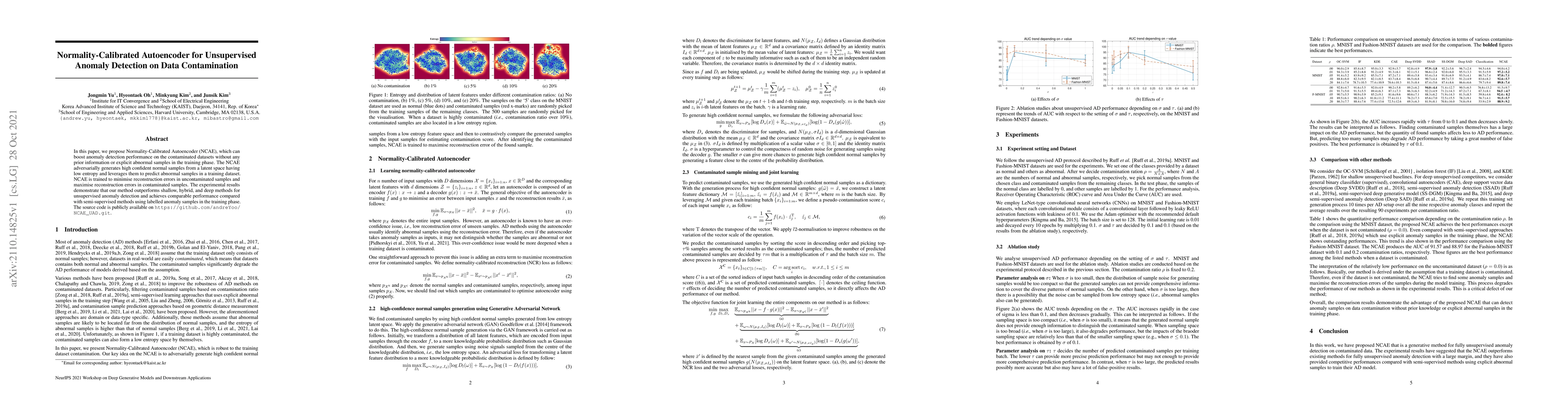 This paper introduces the Normality-Calibrated Autoencoder (NCAE) for unsupervised anomaly detection on contaminated datasets, achieving superior performance without prior information or labeled anomalies. NCAE leverages high-confidence normal samples from a low-entropy latent space to identify anomalies, outperforming shallow, hybrid, and deep methods.