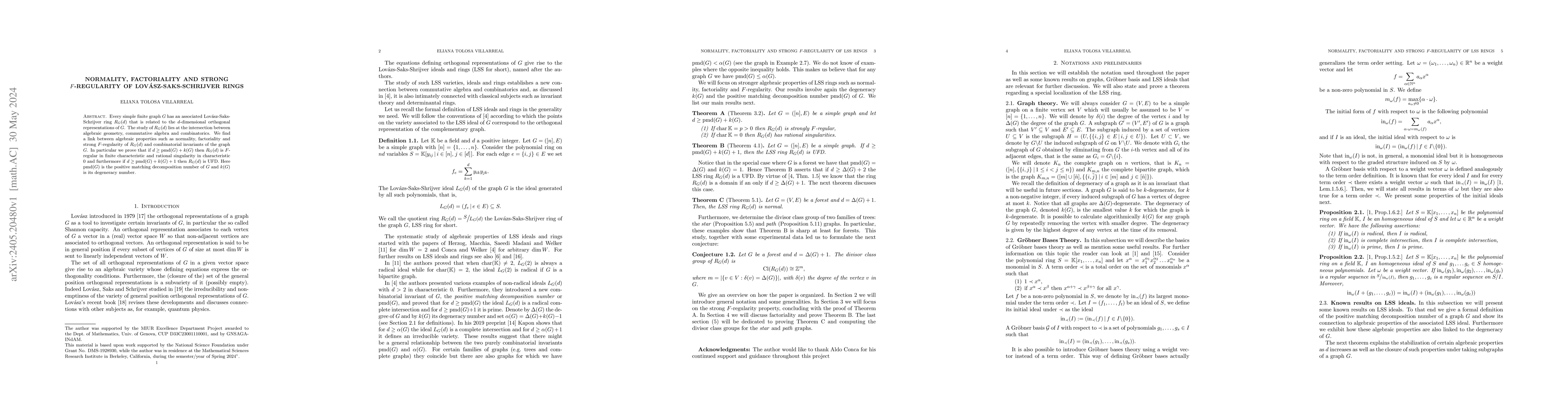 Every simple finite graph $G$ has an associated Lov\'asz-Saks-Schrijver ring $R_G(d)$ that is related to the $d$-dimensional orthogonal representations of $G$. The study of $R_G(d)$ lies at the intersection between algebraic geometry, commutative algebra and combinatorics. We find a link between algebraic properties such as normality, factoriality and strong $F$-regularity of $R_G(d)$ and combinatorial invariants of the graph $G$. In particular we prove that if $d \geq \text{pmd}(G)+k(G)$ then $R_G(d)$ is $F$-regular in finite characteristic and rational singularity in characteristic $0$ and furthermore if $d \geq \text{pmd}(G)+k(G)+1$ then $R_G(d)$ is UFD. Here $\text{pmd}(G)$ is the positive matching decomposition number of $G$ and $k(G)$ is its degeneracy number.