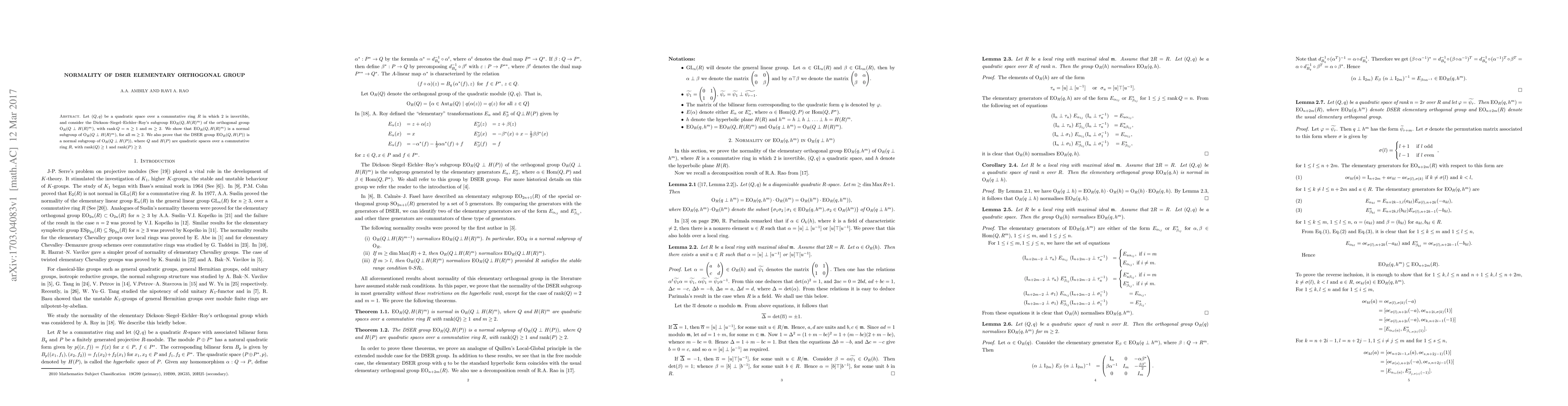 This paper demonstrates that the Dickson-Siegel-Eichler-Roy (DSER) subgroup $EO_{R}(Q, H(R)^{m})$ is a normal subgroup of the orthogonal group $O_R(Q \perp H(R)^m)$ for all $m \geq 2$. It also proves the normality of the DSER group $EO_{R}(Q, H(P))$ within $O_{R}(Q \perp H(P))$ for quadratic spaces over a commutative ring $R$.