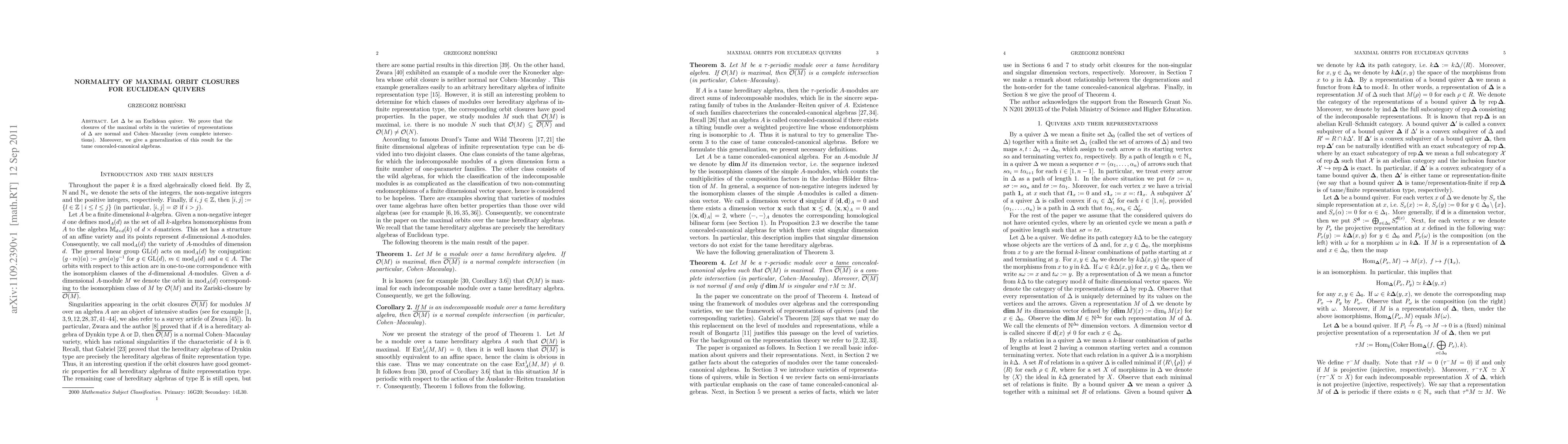 Let Delta be an Euclidean quiver. We prove that the closures of the maximal orbits in the varieties of representations of Delta are normal and Cohen--Macaulay (even complete intersections). Moreover, we give a generalization of this result for the tame concealed-canonical algebras.