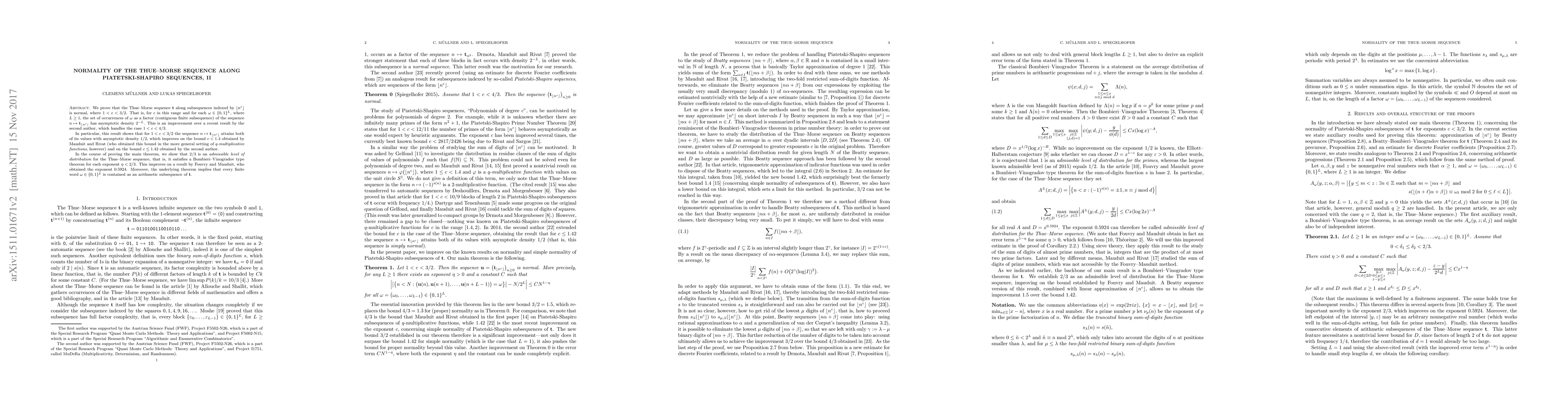 This paper proves that the Thue-Morse sequence along subsequences indexed by $\lfloor n^c\rfloor$ is normal for $1<c<3/2$, improving previous results. It also establishes that $2/3$ is an admissible level of distribution for the Thue-Morse sequence, surpassing earlier bounds.