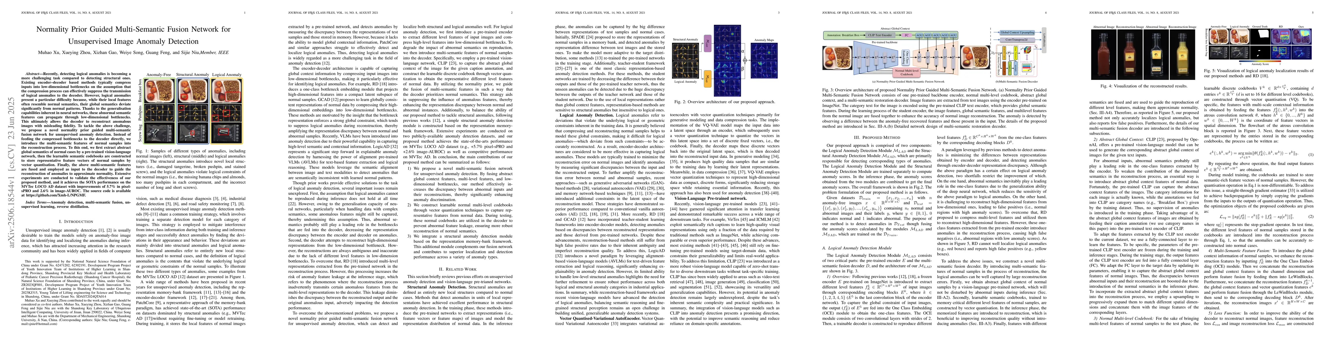Recently, detecting logical anomalies is becoming a more challenging task compared to detecting structural ones. Existing encoder decoder based methods typically compress inputs into low-dimensional bottlenecks on the assumption that the compression process can effectively suppress the transmission of logical anomalies to the decoder. However, logical anomalies present a particular difficulty because, while their local features often resemble normal semantics, their global semantics deviate significantly from normal patterns. Thanks to the generalisation capabilities inherent in neural networks, these abnormal semantic features can propagate through low-dimensional bottlenecks. This ultimately allows the decoder to reconstruct anomalous images with misleading fidelity. To tackle the above challenge, we propose a novel normality prior guided multi-semantic fusion network for unsupervised anomaly detection. Instead of feeding the compressed bottlenecks to the decoder directly, we introduce the multi-semantic features of normal samples into the reconstruction process. To this end, we first extract abstract global semantics of normal cases by a pre-trained vision-language network, then the learnable semantic codebooks are constructed to store representative feature vectors of normal samples by vector quantisation. Finally, the above multi-semantic features are fused and employed as input to the decoder to guide the reconstruction of anomalies to approximate normality. Extensive experiments are conducted to validate the effectiveness of our proposed method, and it achieves the SOTA performance on the MVTec LOCO AD dataset with improvements of 5.7% in pixel-sPRO and 2.6% in image-AUROC. The source code is available at https://github.com/Xmh-L/NPGMF.