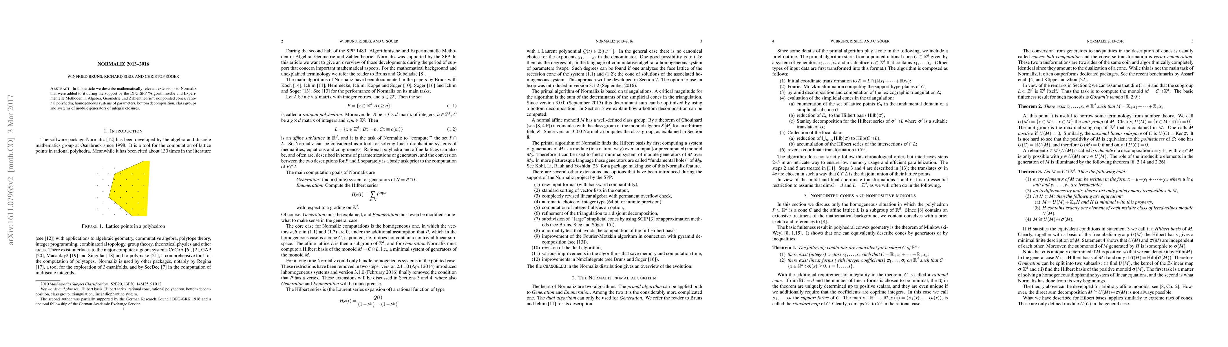In this article we describe mathematically relevant extensions to Normaliz that were added to it during the support by the DFG SPP "Algorithmische und Experimentelle Methoden in Algebra, Geometrie und Zahlentheorie": nonpointed cones, rational polyhedra, homogeneous systems of parameters, bottom decomposition, class groups and systems of module generators of integral closures.