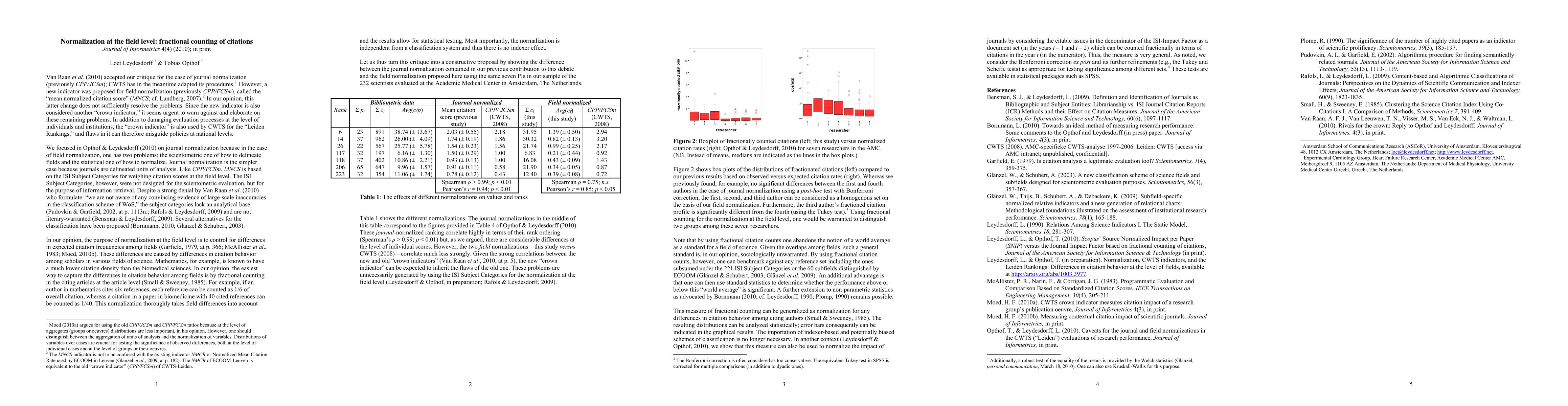 Van Raan et al. (2010) propose MNCS, a new indicator for field normalization addressing citation behavior differences. Fractional citation counting offers a robust solution for normalization, applicable in university rankings and for calculating a normalized impact factor.