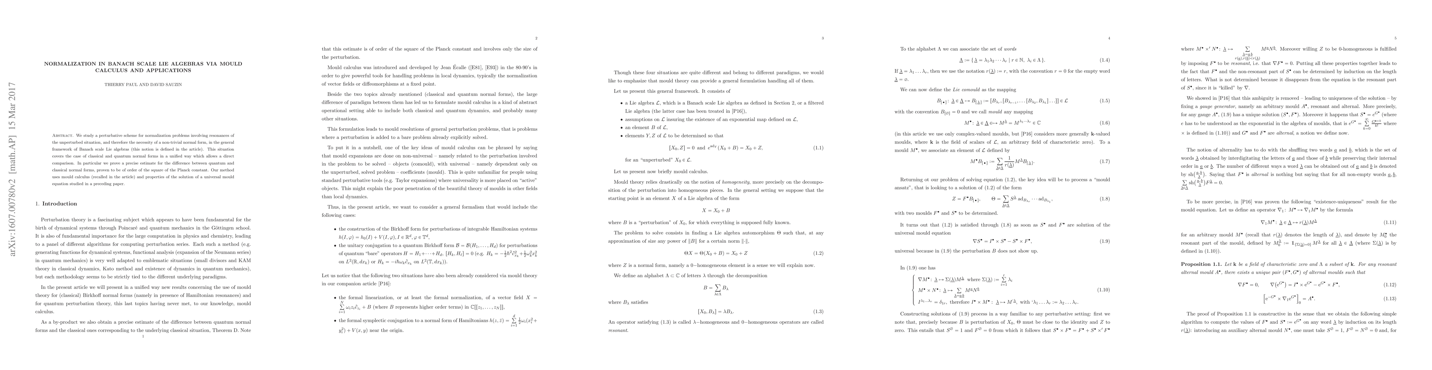This paper develops a normalization scheme for Banach scale Lie algebras using mould calculus, addressing resonances and providing a unified approach for both classical and quantum normal forms. The method yields a precise estimate showing the difference between quantum and classical forms scales with the square of the Planck constant.
