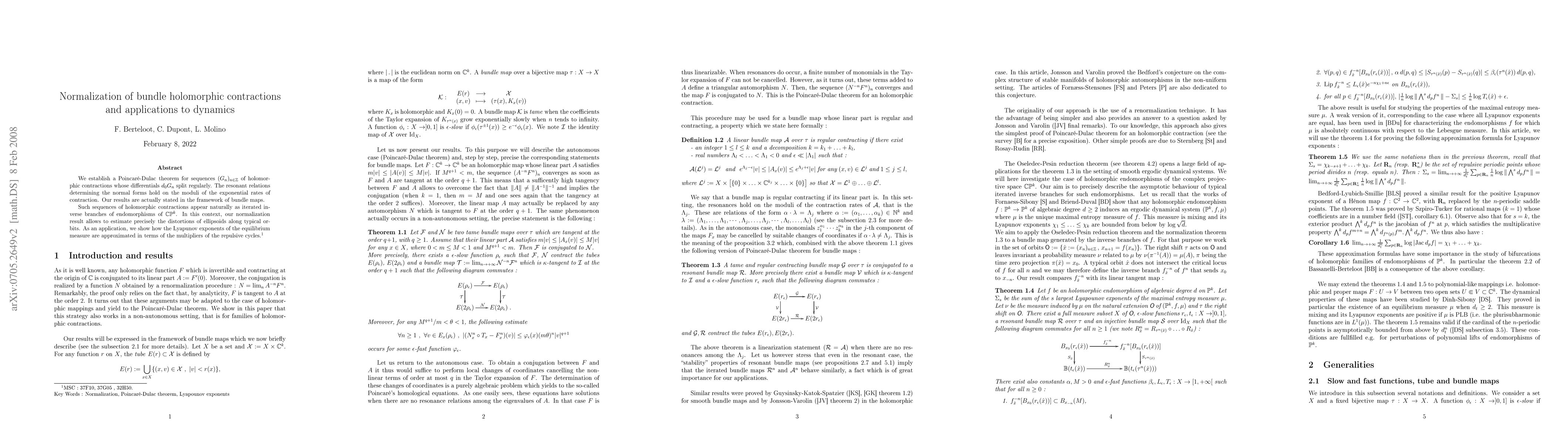 We establish a Poincar\'e-Dulac theorem for sequences (G_n)_n of holomorphic contractions whose differentials d_0 G_n split regularly. The resonant relations determining the normal forms hold on the moduli of the exponential rates of contraction. Our results are actually stated in the framework of bundle maps. Such sequences of holomorphic contractions appear naturally as iterated inverse branches of endomorphisms of CP(k). In this context, our normalization result allows to precisely estimate the distortions of ellipsoids along typical orbits. As an application, we show how the Lyapunov exponents of the equilibrium measure are approximated in terms of the multipliers of the repulsive cycles.