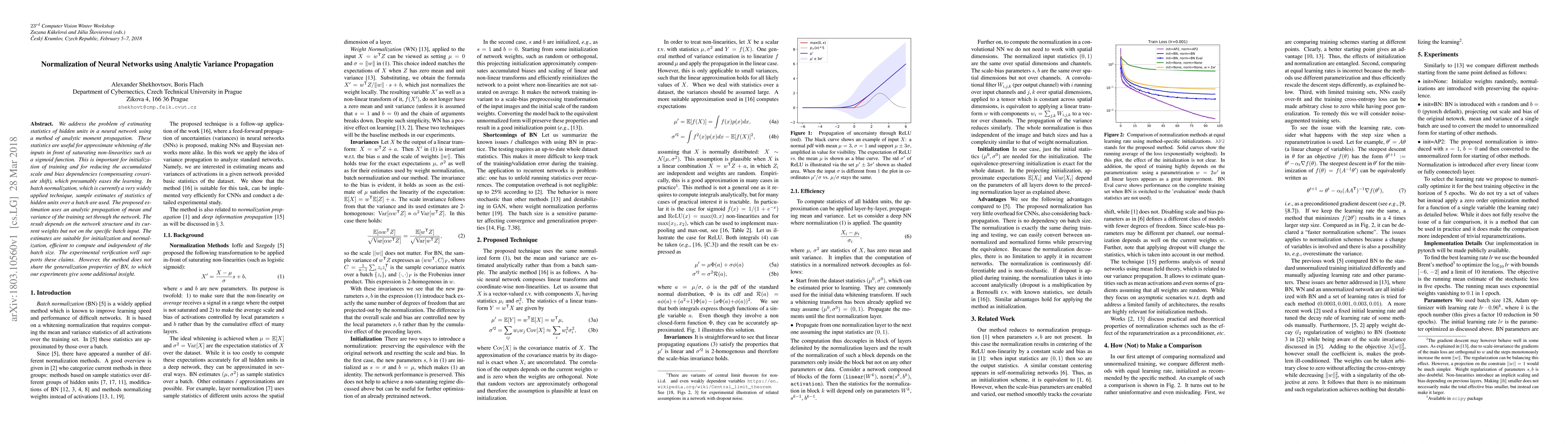 This paper proposes an analytic variance propagation method for normalizing neural networks, aiming to estimate the statistics of hidden units without relying on batch samples. This approach facilitates initialization and normalization, is efficient, and independent of batch size, though it lacks the generalization properties of batch normalization.
